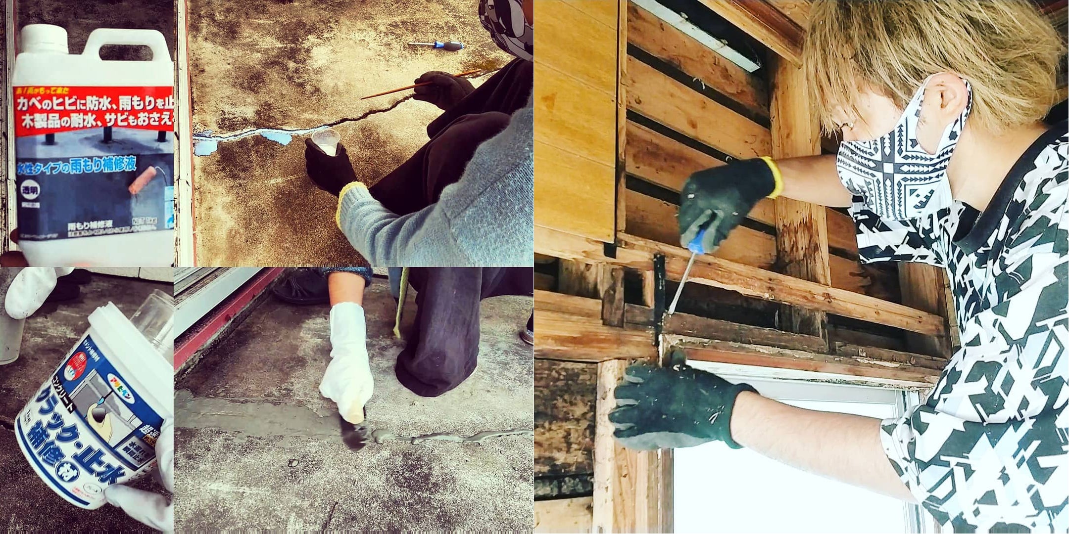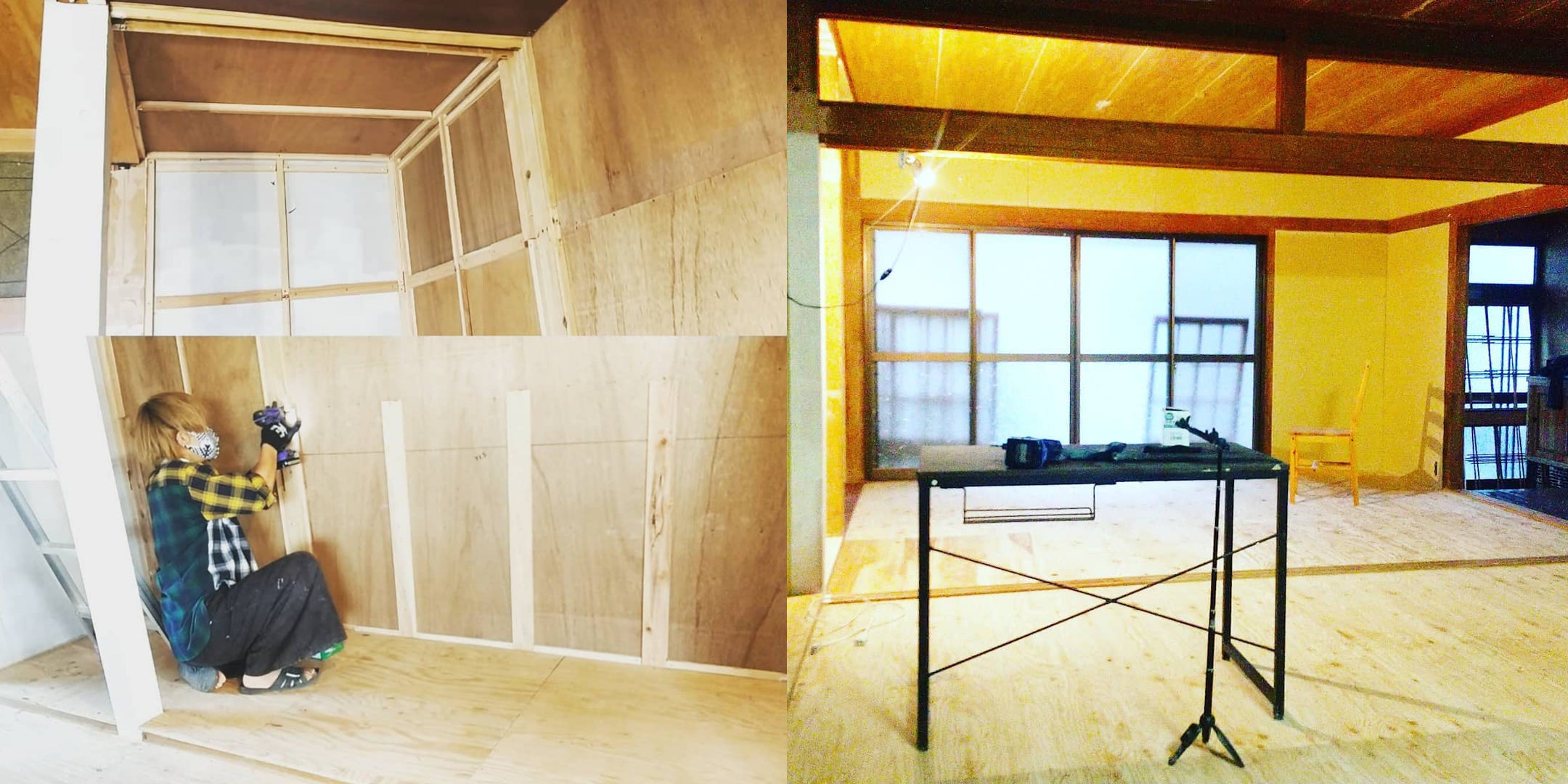 雨漏りの原因を突き止め修繕し、畳をはがして洋室の床をつくり、石膏ボードで壁をつくり、塗装をして壁紙を貼りました。