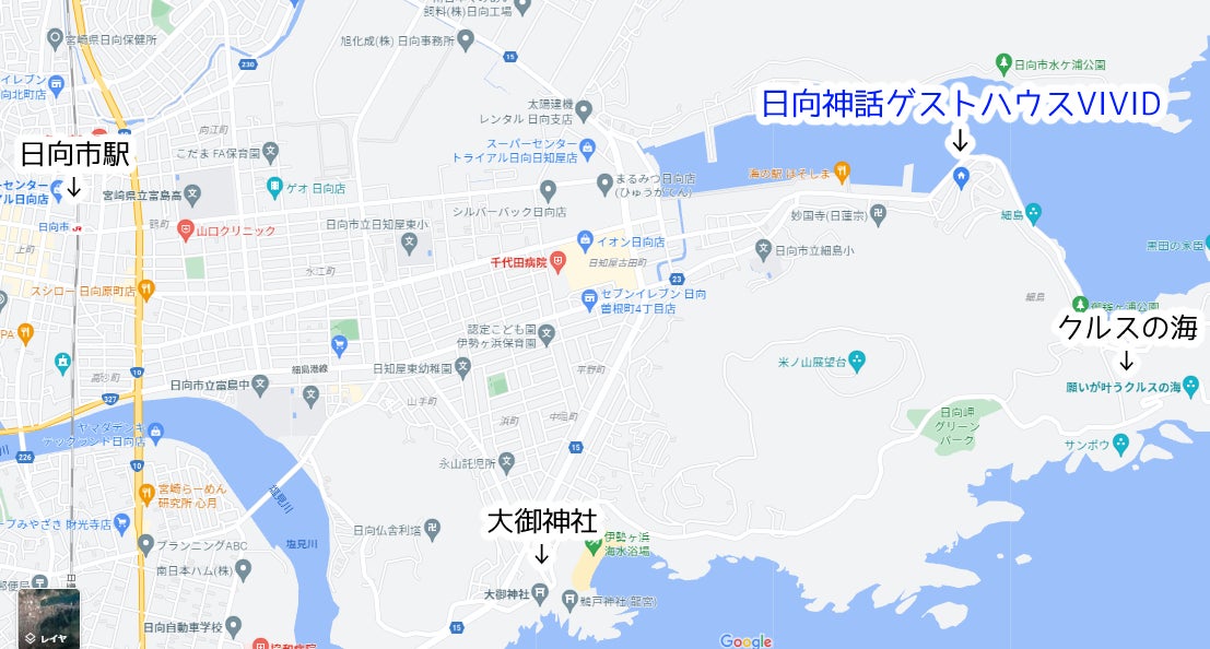日向市駅から車で約10分。自転車だと30分くらいです。