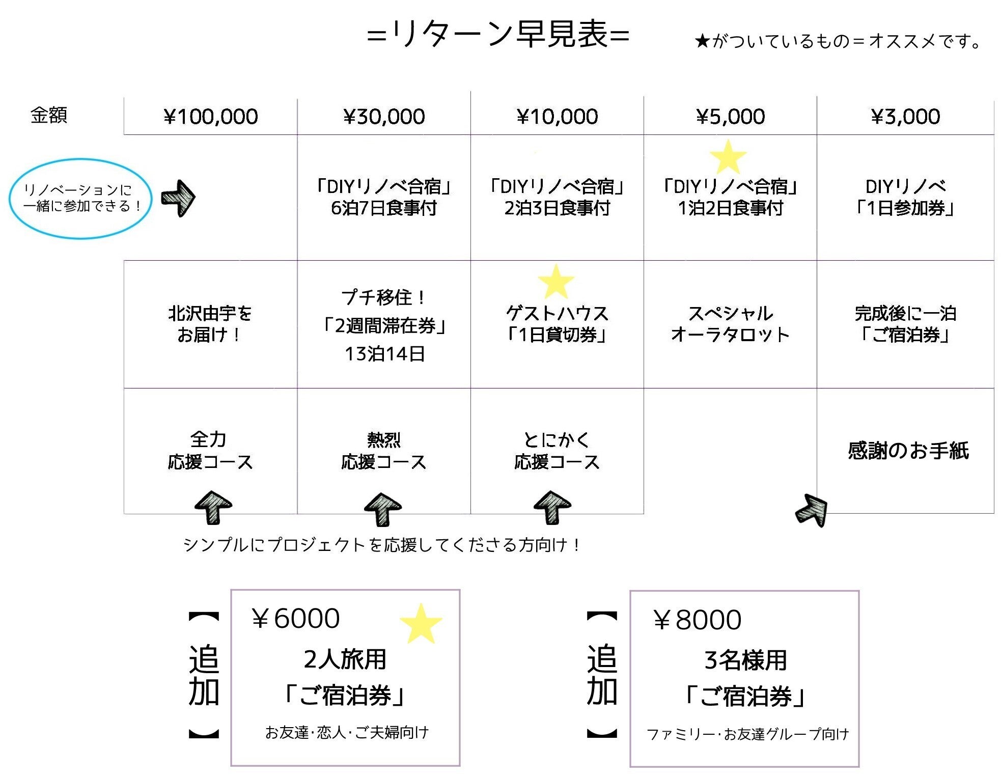 目玉のリターンは「DIYリノベ合宿」。日帰り1日参加、1泊2日、2泊3日、一週間(6泊7日)滞在コースからそれぞれお選びいただけます。海の近くで一緒にゲストハウスを作ってくれる人を大募集! 実施期間は2022年5月~7月(ご都合に合わせて日程調整可能)。食事つき、DIYやったことない人歓迎です!