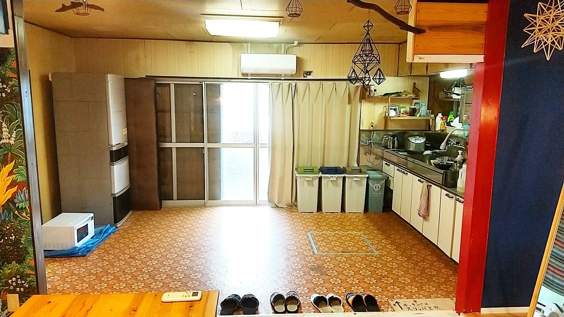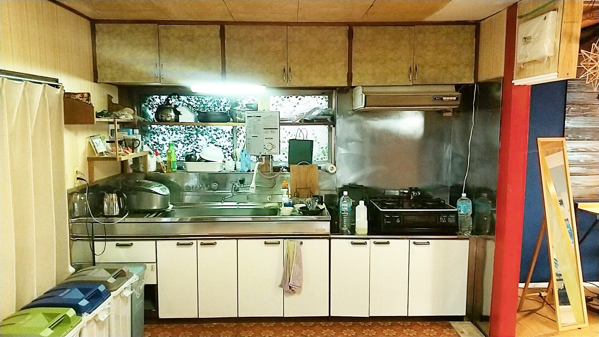 現在の共用ダイニングキッチンの様子です。床の木がところどころ雨漏りで腐っており、歩くと少しぶかっと凹む箇所があります。