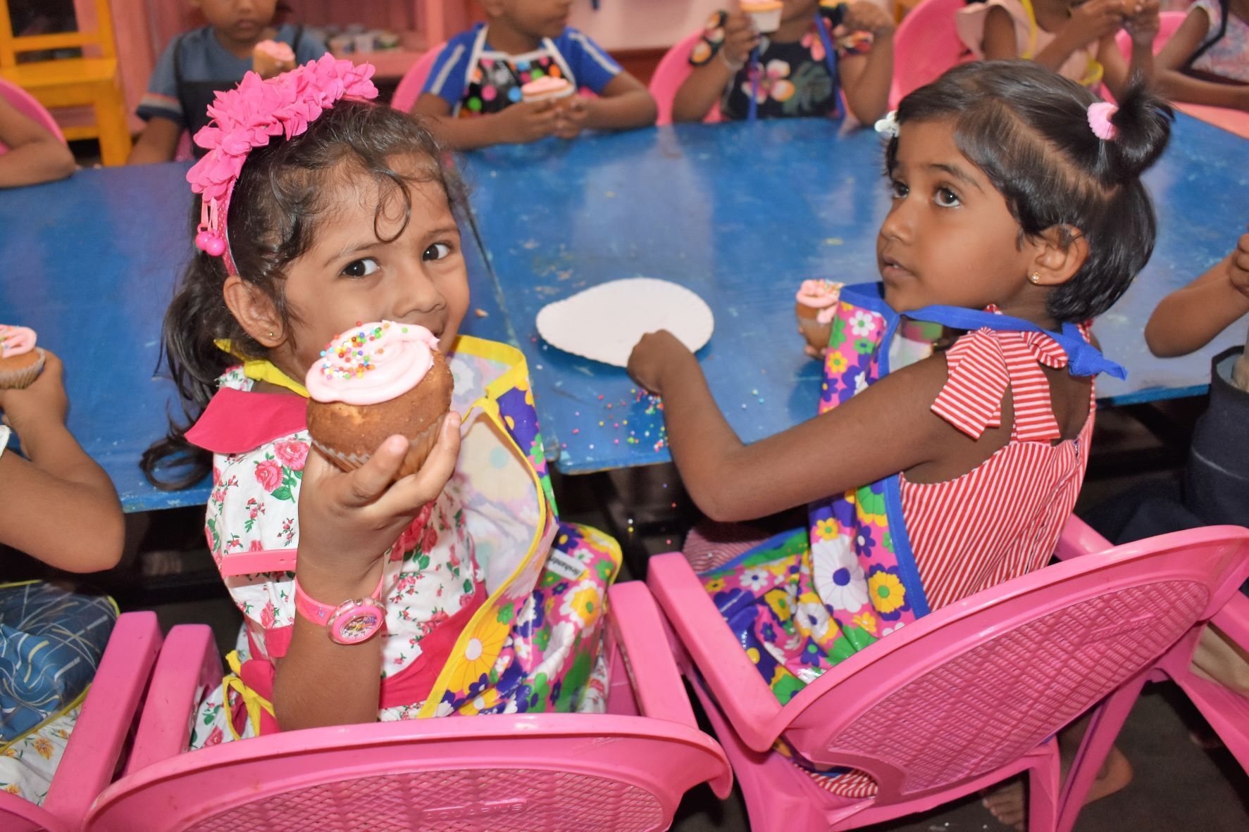 今日は「カップケーキデー」です。市販のカップケーキを持参し、アイシングを作って、自分でにゅるにゅる~。カラフルシュガーをパラパラ! 素敵なオリジナルカップケーキの出来上がりです。お持ち帰りもしたいので、特大カップケーキも作りました!