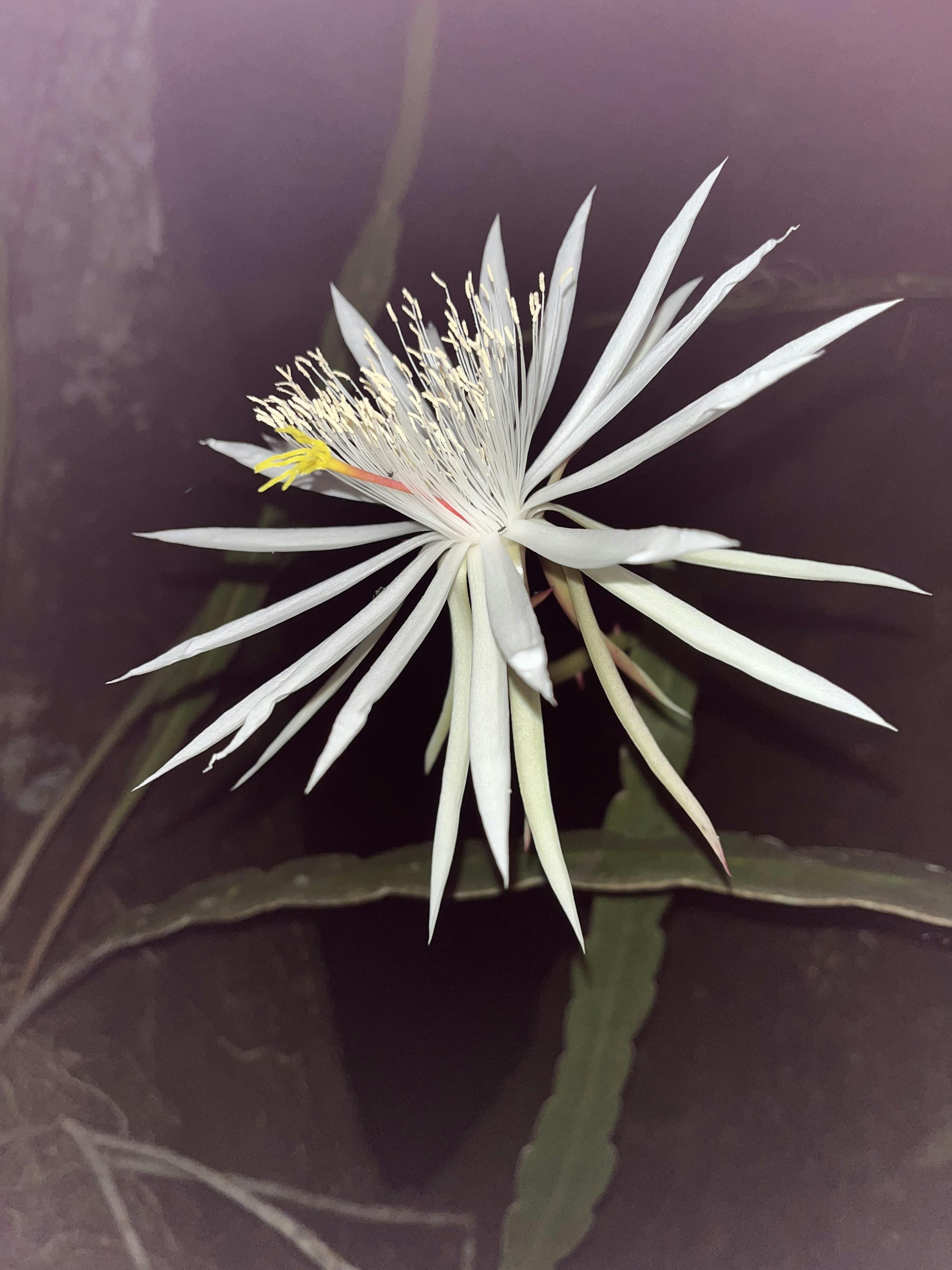 ユニカル幼稚園の園庭で咲いた「月下美人」です。本当に、満月の夜に咲くんですよ! 毎月ではありませんが、時々花芽が葉につき、満月の夜中に開きます。朝にはしぼんでしまう、一夜限りのお楽しみです。