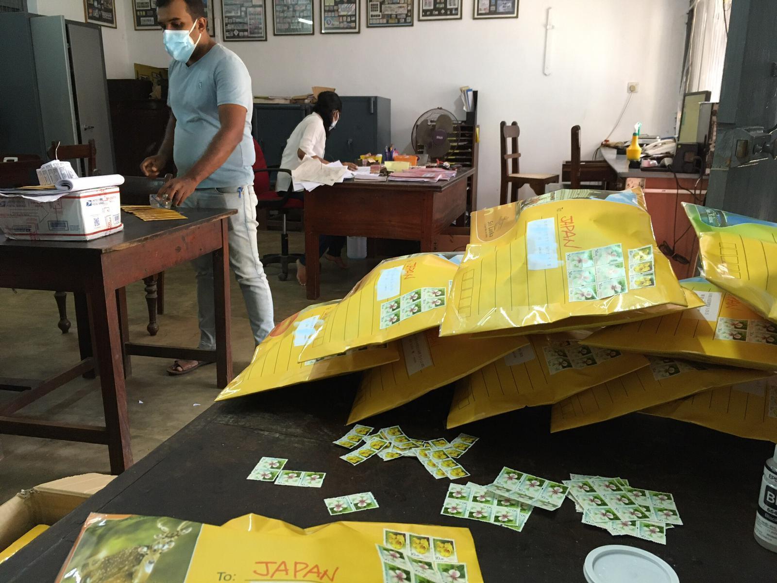1ヵ月半に及ぶロックダウンが10月1日に解除され、公共サービスも再開しました。8日㈬からようやく海外向け小包も受け付けしてもらえ、お礼の品の発送を始めました。お楽しみは、中身よりも切手にあります。上の写真は村の郵便局。高額の切手がなく、少額の切手をたくさん貼りました。330ルピーのところ、全部10ルピー切手になった方も。そんな “大当たり” はどなたでしょう?10日㈮は、再開後の大混雑も落ち着いてきたミーリガマの本局へ行ってみました。本局はやはり厳しく、中身をすべてチェックするので「開封したまま持って来るように」言われ、梱包作業は局内で頑張りました! 「本局なら料金スタンプで楽勝!」と思っていたら、何故か白い紙に印刷された料金票を糊付けするという、何とも原始的な作業が待っていました。しかも4枚に分割されていて‥‥。スリランカのボロさを大笑いしてくださいね。