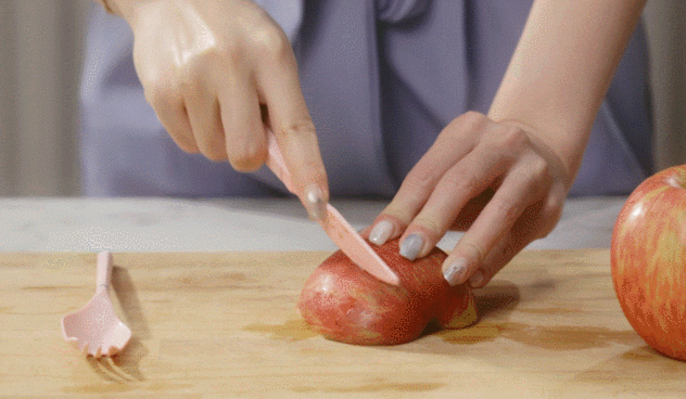 一般的なプラスチックでは簡単に折れてしまいそうなリンゴも簡単に切断。
