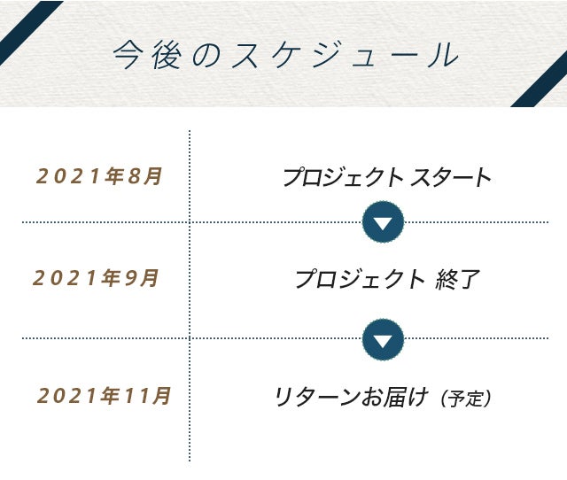 ◯ 引渡し時期: 各リターン詳細に記載の発送予定月を引き渡し時期とします。但し、開発・生産状況によって遅れが生じる場合がありますのでその際は当プロジェクトページ内の「活動報告」または購入者へのメール等で連絡します。
