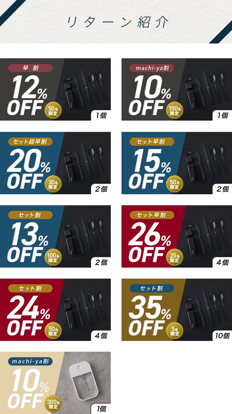※ リターン価格とは別にcampfire(machi-ya)のシステム利用料として1支援毎に200円(税別)が支援者様の負担となります。尚、このシステム利用料はcampfireが受け取るもので、当社が受領するものではございません。