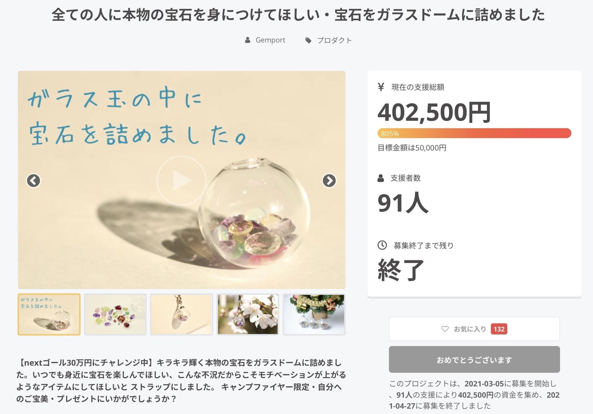 2021/06/21 13:09この度は皆様のたくさんのご支援頂きありがとうございます。なんとか最終日に目標達成ができました。今回のリターンは6月中に届くよう只今準備しています。今しばらくお待ちください!♪最後になりますが、宝石は無くても生きていけます。必需品ではありません。しかし宝石があればもっと心を豊かにしてくれる眺めるだけでストレスを減らしてそんな必需品になると私たちは信じています。また新しい企画やプロジェクトを行いますので、また次回お会いしましょう♪♪ もっと見る