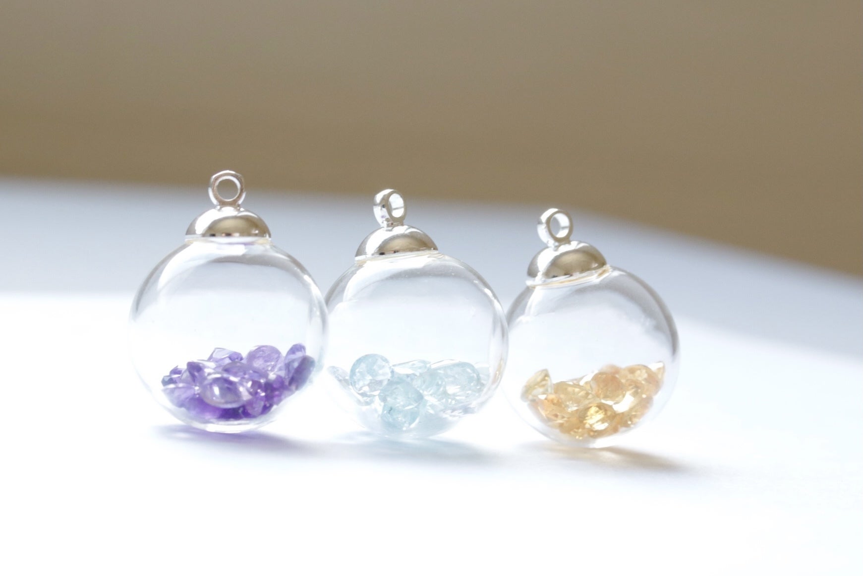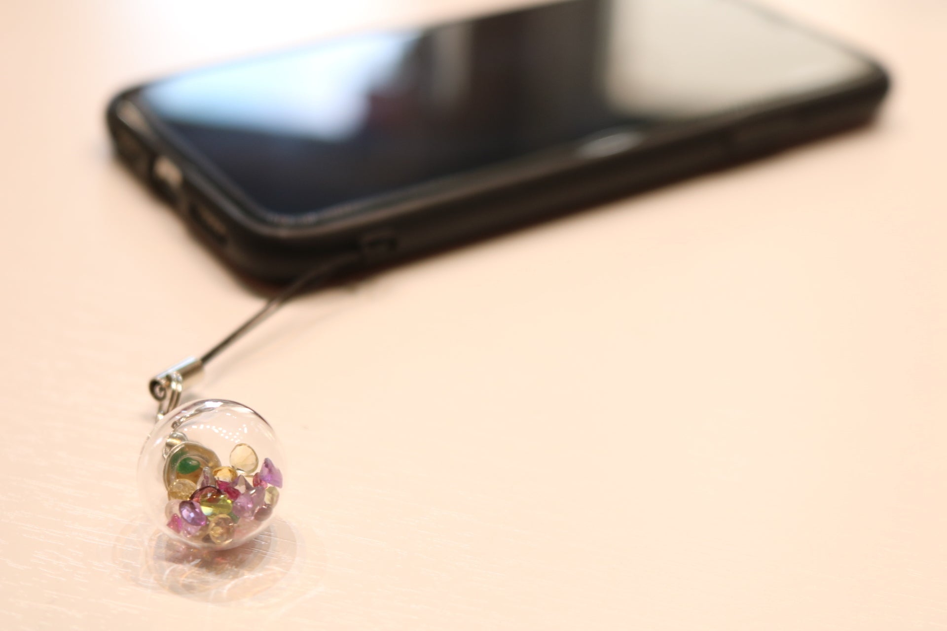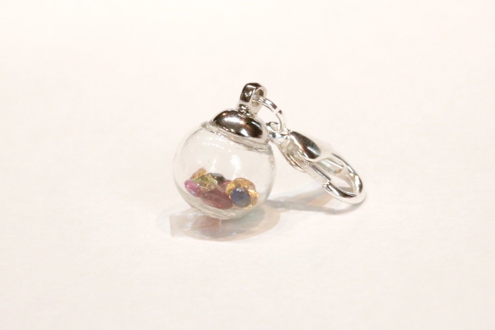宝石を身につけたいけどジュエリーにするのは高額と言う事で綺麗なガラスドームに詰めました。ストラップにしていますので、いつでも宝石を眺める事が可能です。
