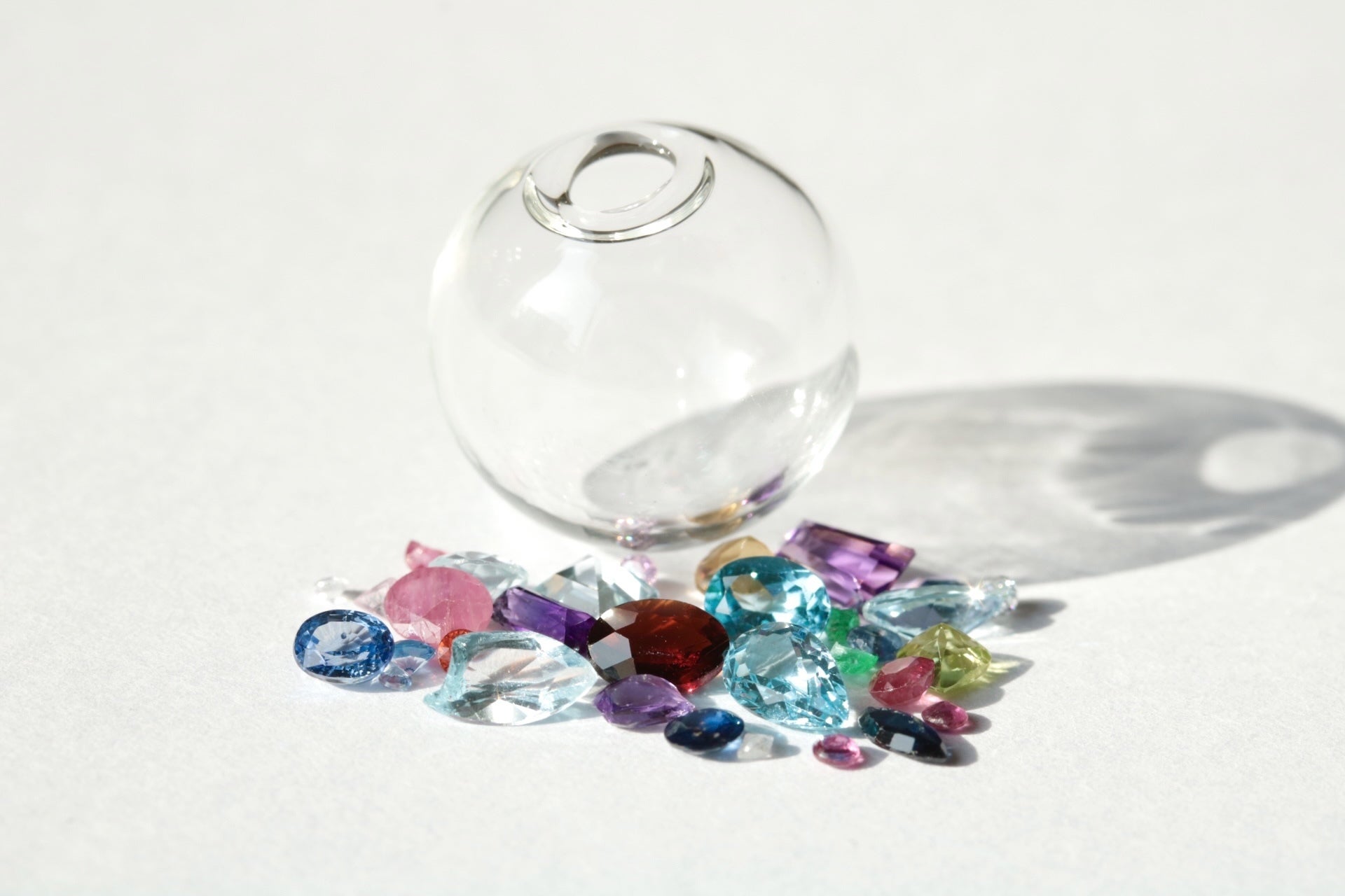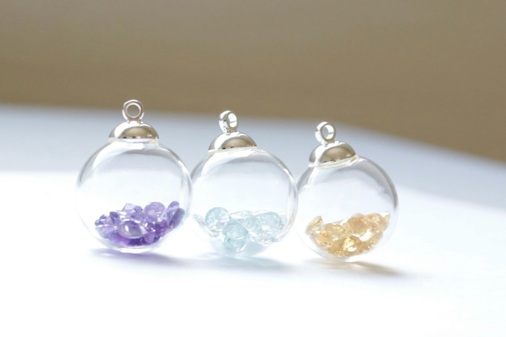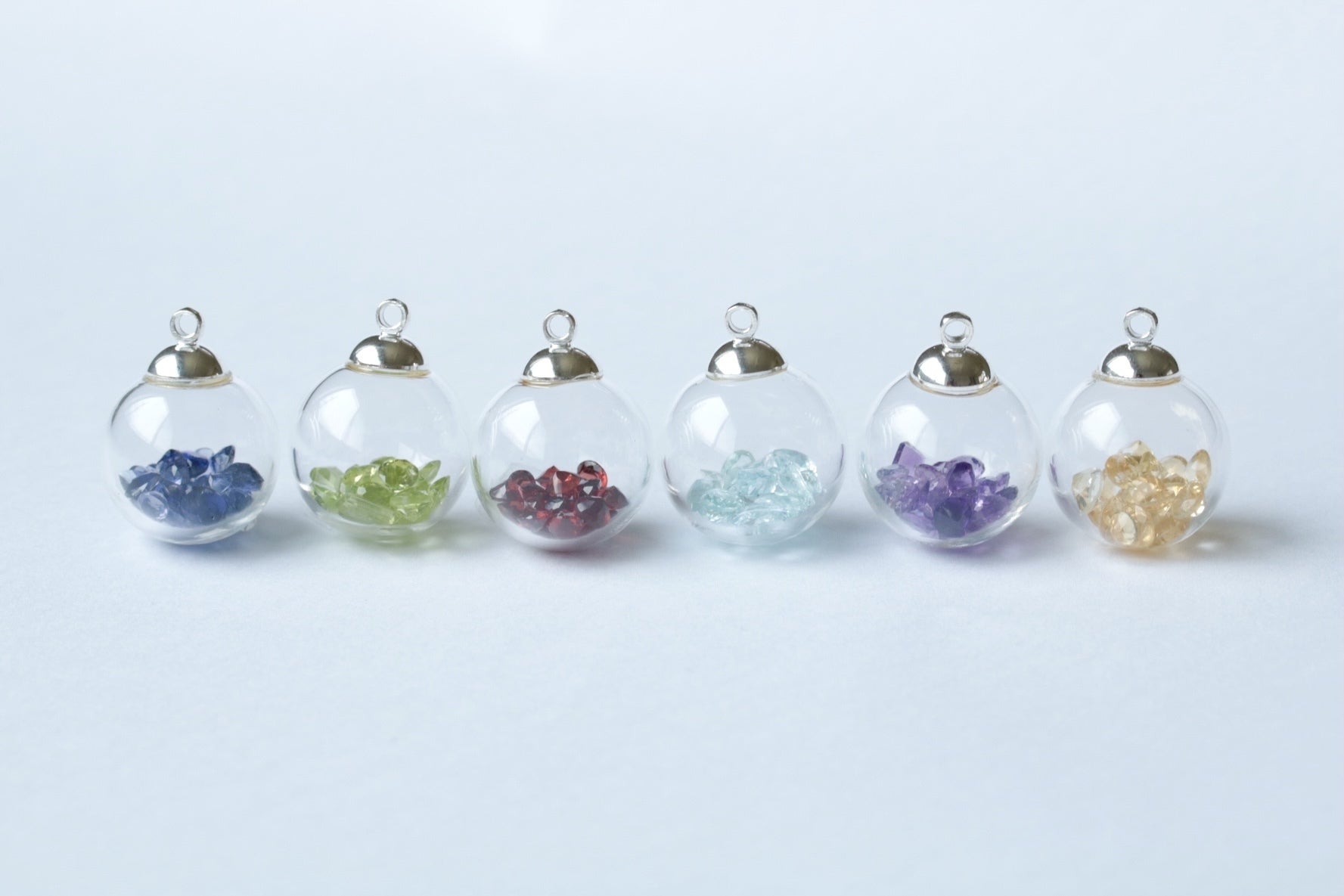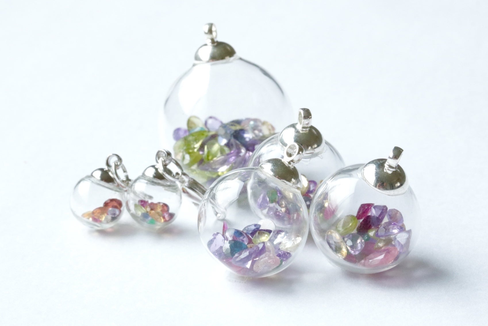 宝石を身につけたいけどジュエリーにするのは高額と言う事で綺麗なガラスドームに詰めました。ストラップにしていますので、いつでも宝石を眺める事が可能です。