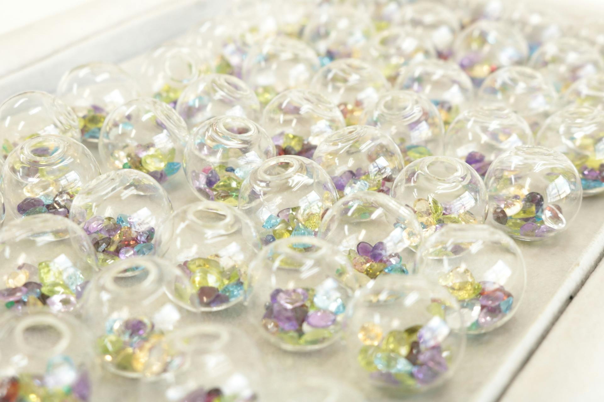 今回のガラスドームの入り口は小さく極小な宝石しか入りません、そんな高価な極小宝石を贅沢に5ct(1g)以上詰めました。ストラップ付