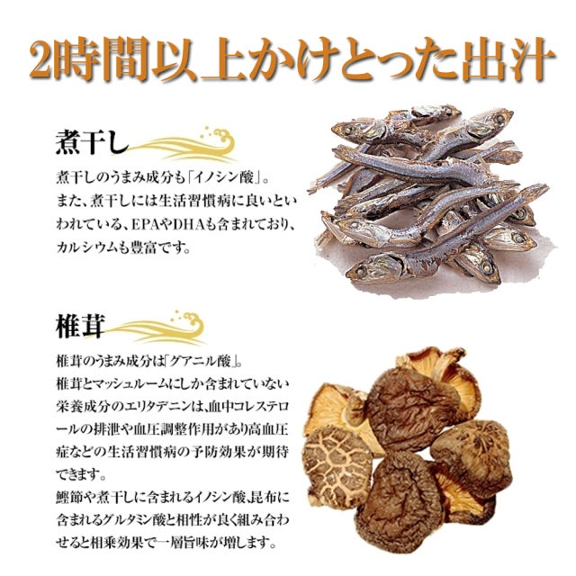 だしは国産のしいたけ、昆布、煮干しを2時間以上漬け込み鰹節を加えて炊き出し、1番だしと2番だしを合わせ深みを出しています。手間ひまをかけることで上品でありながら琥珀色たまりに負けないだしに仕上がりました。