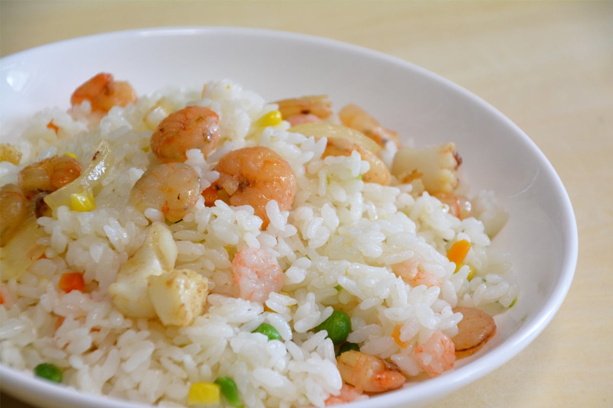4・米の上に2の具材を広げてのせる。(ここでかき混ぜないように注意)