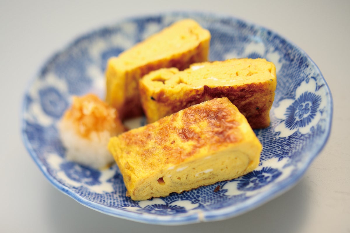 材料を全て混ぜ合わせ、熱したフライパンに油をひき、何回かに分けて卵液を流し入れ巻いていく。