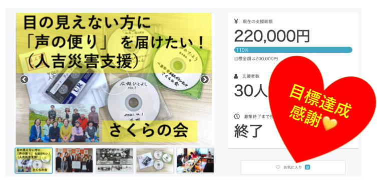 2021/09/16 10:42おかげさまで、プロジェクトは成功裏に終了いたしました。みなさまの暖かいご支援のおかげで、目標額を達成することができました。心より御礼申し上げます。これを励みに、今後も目の見えない方に音声で様々な情報をお届けする活動を続けてまいります。 人吉市音声訳ボランティア さくらの会 もっと見る9月1日/さくらの会例会を行いました