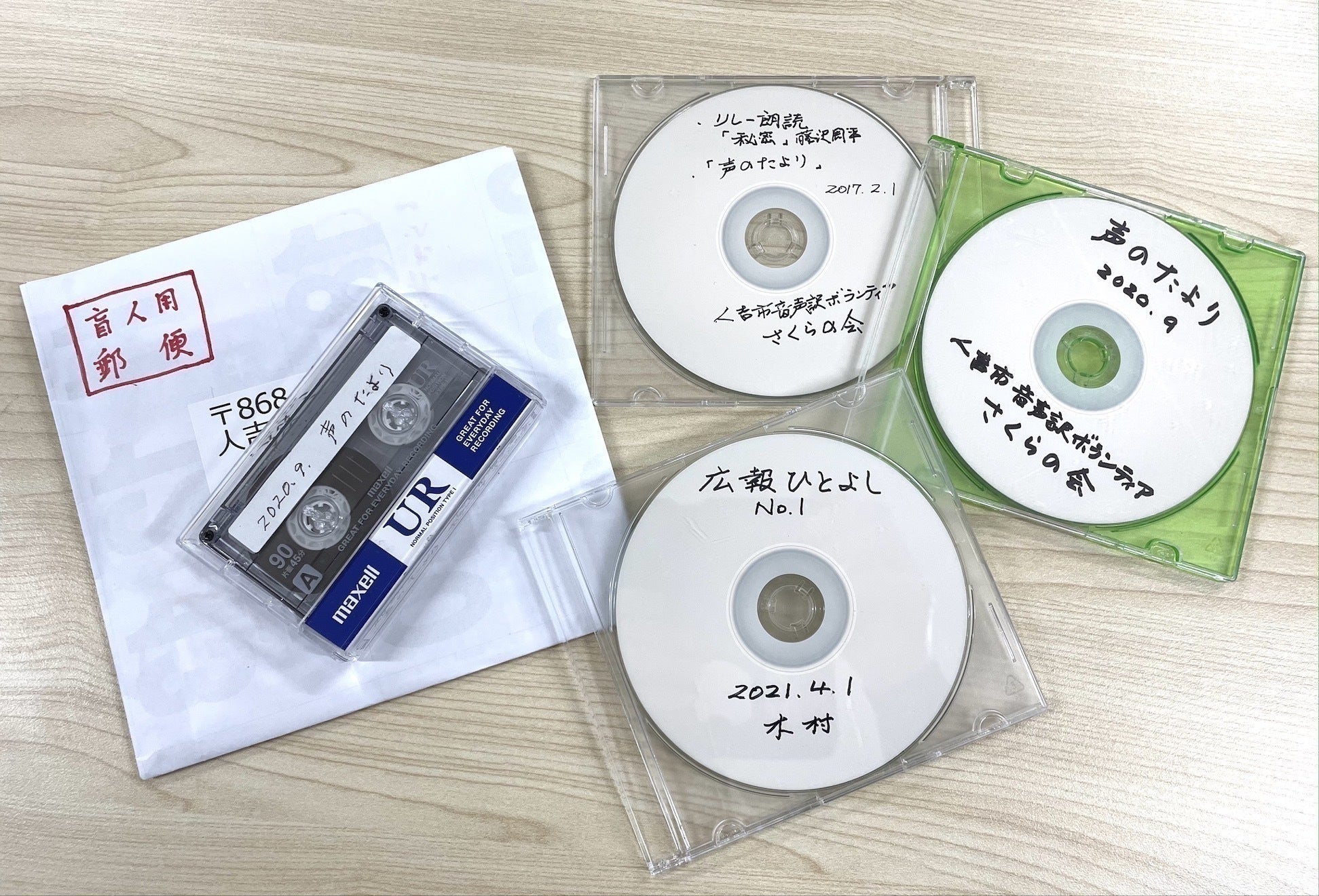 私たちは、長年にわたり視覚障害者の方に、音声で「広報人吉」「社協だより」「声のたより」を提供してきました。テープやCDに録音してお届けする活動です。