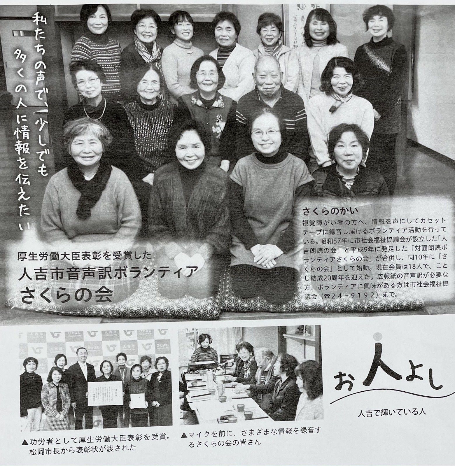 さくらの会では、カセットテープやCDに「広報ひとよし」や「社協だより」などの身近な情報を声に出して録音し、目の不自由な方に届けるボランティア活動を30年以上行っています。平成28年7月からは視覚障がい者の方だけでなく、寝たきりの方や入院している方などにも声の情報を届けるようになり、現在も“声の情報”を求める方に提供し続けています。