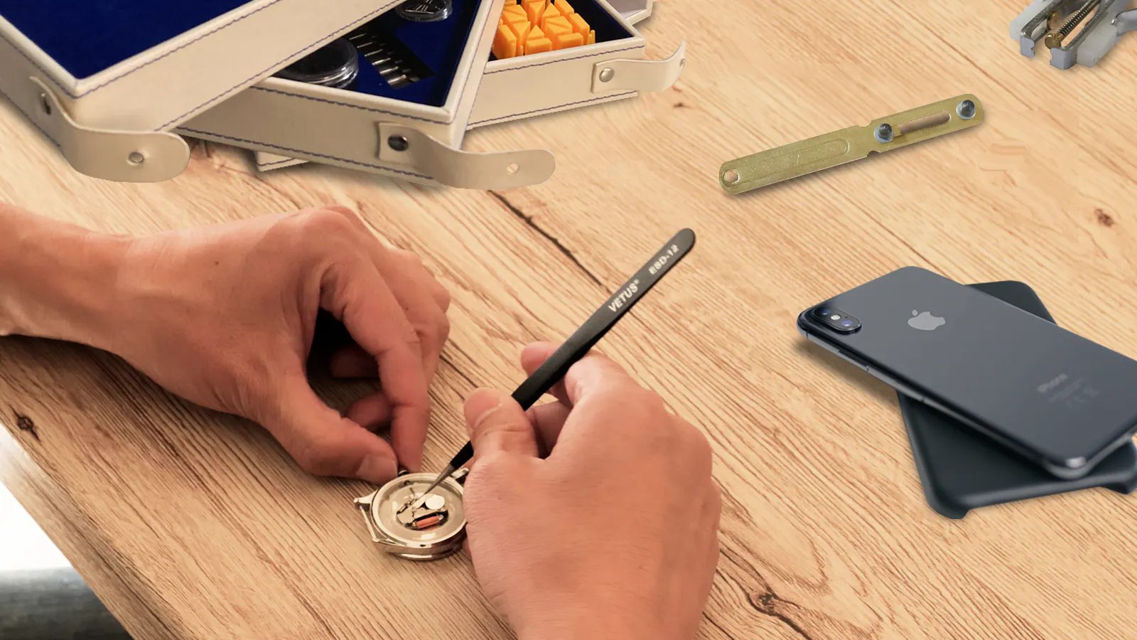 腕時計のパーツを組み上げる付属の制作用工具もプロも使用するピンセットをはじめ、8種類巣全て職人も唸る!?逸品です。