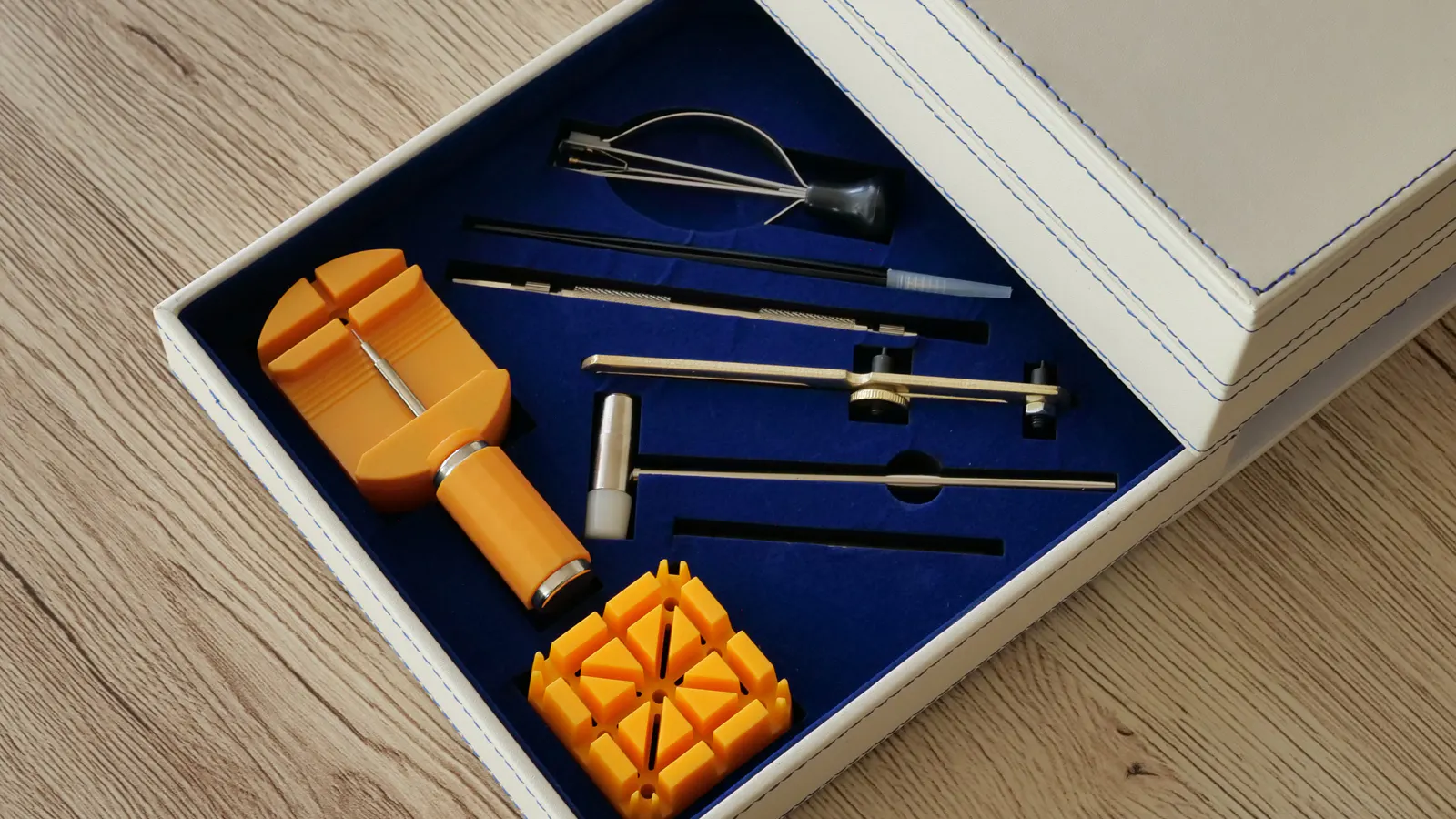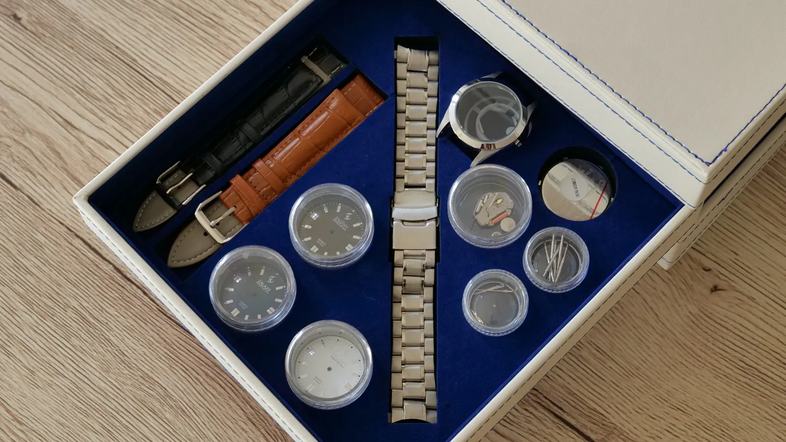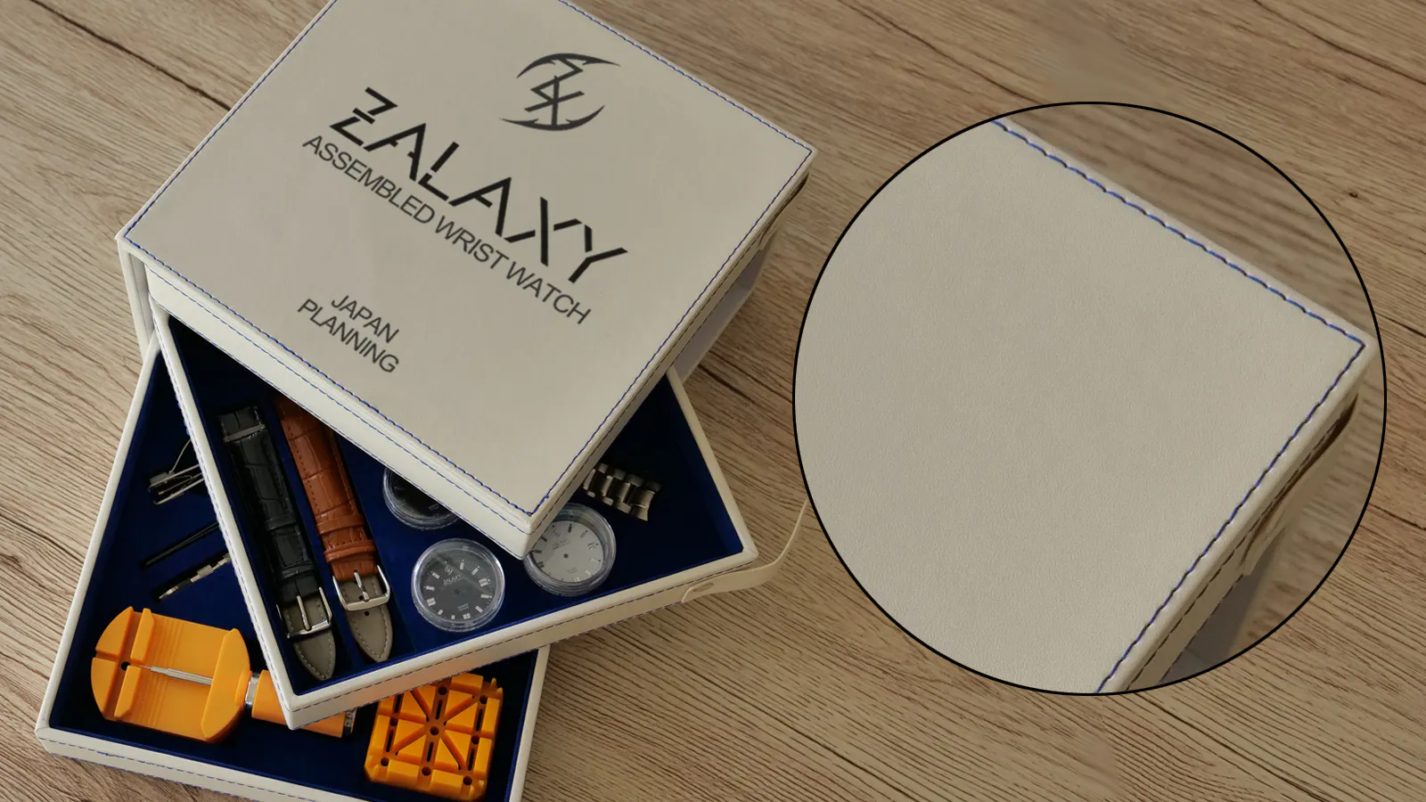 高級感と清潔感を兼ね備えた白のPUレザーにブルーのステッチがお洒落な収納ボックス。扇子を広げるようにスライドさせるハイセンスな引き出しは3段に分かれており、2つは各種パーツと工具が収納されております。残りの1つは、お手持ちの腕時計やちょっとした小物入れとしてご利用いただけます。