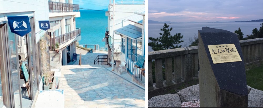 そして、伊和都比売神社の前には穏やかな瀬戸内海を望み、鳥居の横には”恋人たちの聖地”のモニュメント。脇の道は海へ下る”キラキラ坂”(地元の方が名づけました)。