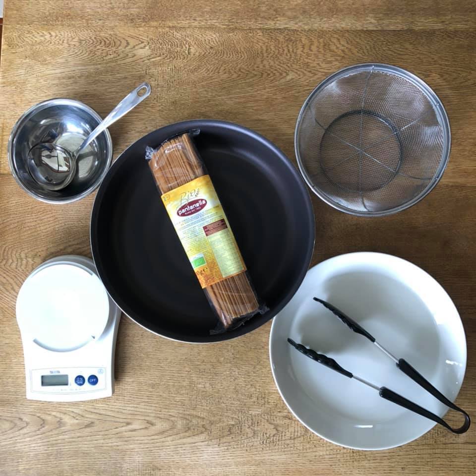 鍋又はフライパンに湯を沸かし、2%の塩を加え、パスタを茹でる。