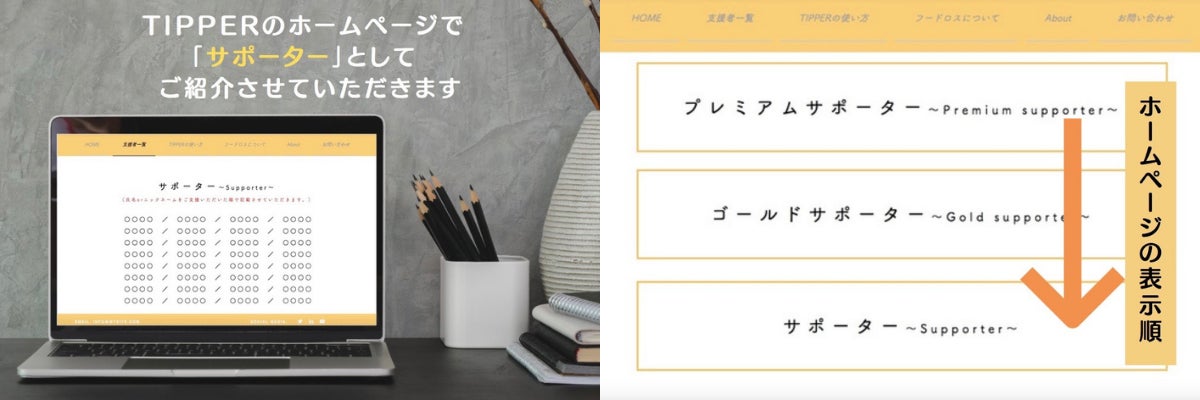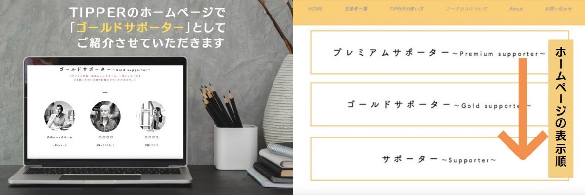 ▷TIPPERのホームページ内の「支援者一覧」ページにて【お名前、お写真、一言メッセージ】をご紹介させていただきます。(ゴールドサポーター内での表示順はご支援いただいた順になります。)
