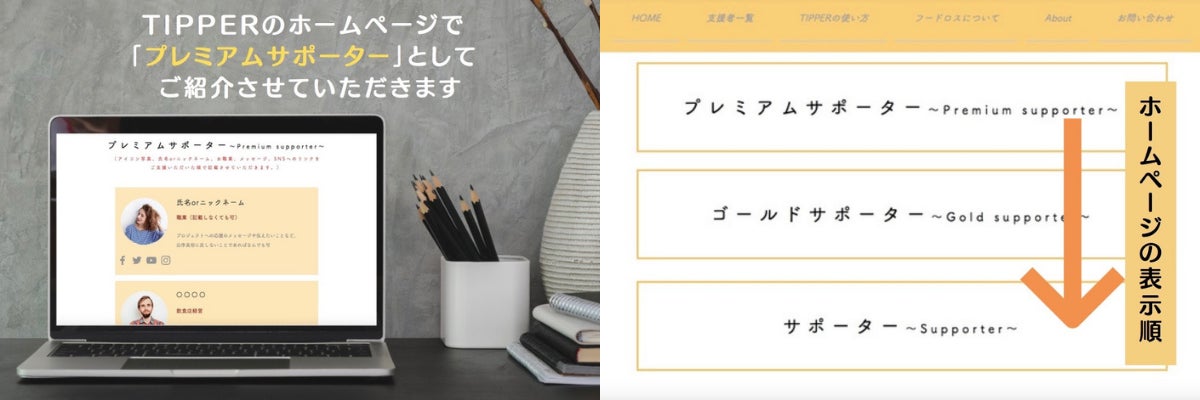 ▷TIPPERのホームページ内の「支援者一覧」ページにて【お名前、お写真、職業、メッセージ、SNSへのリンク】をページ最上部にてご紹介させていただきます。(プレミアムサポーター内での表示順はご支援いただいた順になります。)