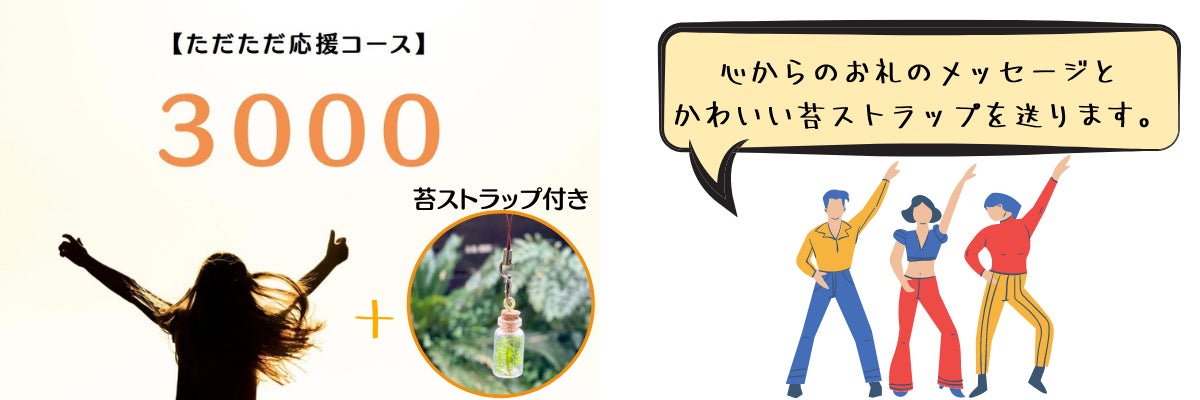 「お礼のメッセージ」と「かわいい苔入りストラップ」をお送りさせていただきます。