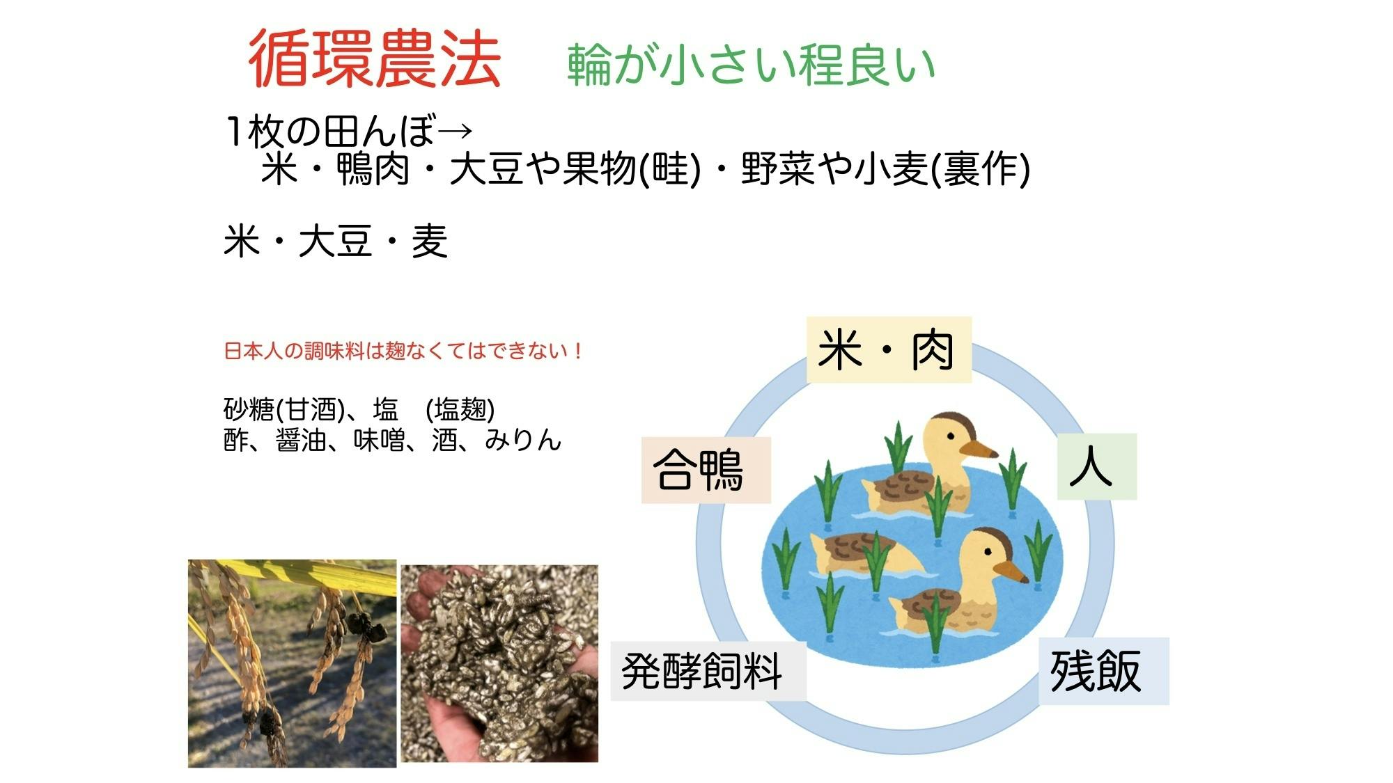 農薬や化学肥料を使わず、合鴨という家畜を飼ってこだわって作るお米は手間もかかり値段も高くなります。農園に売れ残っていた合鴨米と合鴨肉を見た時に、この良さを多くの方に知っていただく場所をつくり循環させたいと思いました。萬田先生が霧島生活農学校を立ち上げられ、教室として農園の納屋が改装される事になりその場所をお借りしてカフェをオープンする事となりました。農園で採れるものを最大限に生かしたいとの思いもあり上級麹師の資格を取得し、農園で採れた合鴨米から米糀を自家製する技術を身につけ合鴨米と糀・合鴨肉を使った料理を提供するメニューにしました。