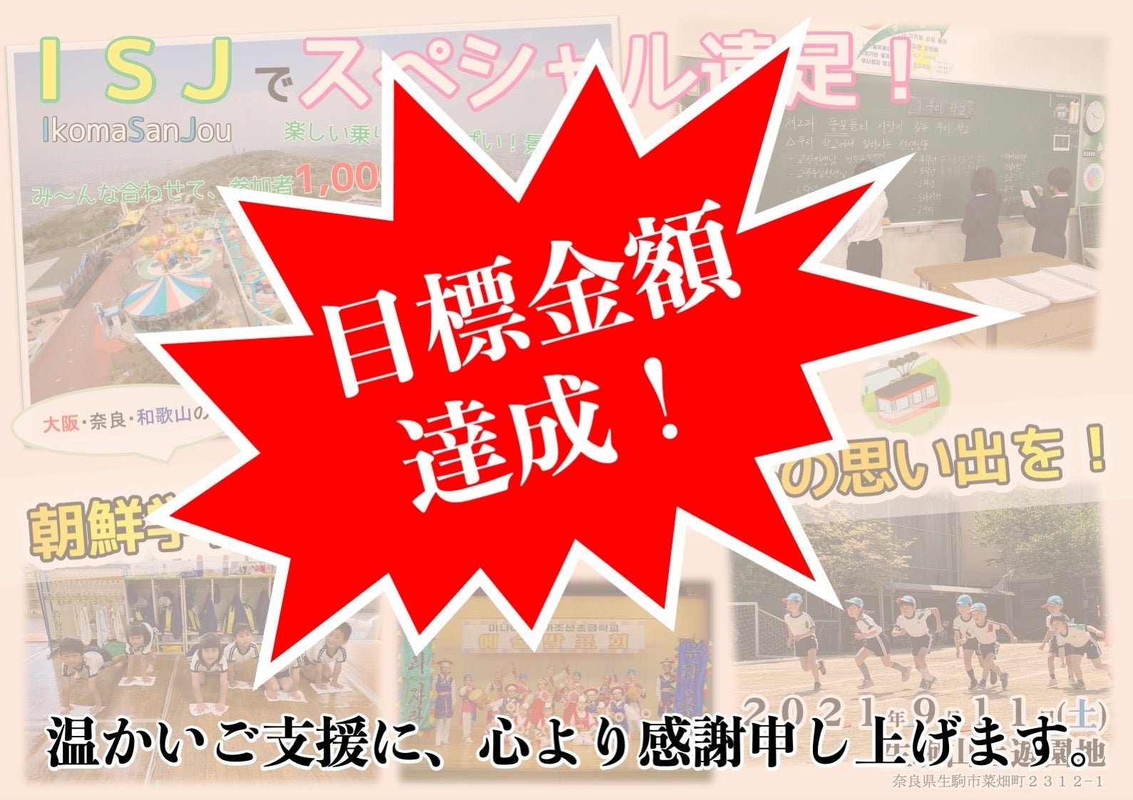 【当プロジェクトに温かいご支援をくださった皆さまへ】大変心苦しいお知らせです…ご周知のように、この夏以降、猛威をふるい始めた新型コロナ『デルタ株』変異ウイルスの急激な拡大状況に鑑み、8月28日(土)、我々実行委員会代表とイベントに参加する各学校校長先生たちとで、イベント開催可否について協議を行いました。学校現場の責任者である校長先生たちから出された意見を踏まえ、実行委員会で討議した結果、・学校教職員、学生園児とその保護者内で、コロナ陽性判定者および濃厚接触者がこれまでとは違う次元で拡がっている現状・そのような現状と、社会全体における緊張感の高まりから、2学期の学校生活や運動会をはじめとした学校行事すらも不安視される中、イベントをそのまま開催することの整合性・たとえイベントを決行したとしても、これまで準備を進めてきた我々の、イベントにかけたせっかくの想いや趣旨が、むしろ裏目に出てしまうのではという憂慮主にこのような理由から、今回イベント開催を延期とする苦渋の判断をいたしました。当実行委員会では、イベント立案から現在に至るまで、続くコロナ禍の中でも会議を重ね、またコロナ感染予防対策措置の徹底など、生駒山上遊園地スタッフとの綿密な協議を何度も行いながら準備を進めてまいりましたが、支援者の皆さま、本当に申し訳ありません。実行委員会メンバーも、このもどかしい気持ちをどこにぶつければ良いのかわからず、戸惑いを隠し切れません…延期日程につきましては、現在未定です。来年3月までの学年度内になんとか開催できればと考えておりますが、ただ、それがたとえ一年後になろうとも、子どもたちのために必ず本イベントを実施し、成功させようというのが実行委員会の決意です。ご支援いただいた資金は、そのときまで責任をもって管理し、皆さまの温かい想いを、必ず形にして子どもたちへ届けることを約束いたします。開催日程が決まり次第、改めてお知らせすると共に、イベント準備状況も適時ご報告いたします。何卒、深いご理解・ご協力賜りますよう、よろしくお願い申し上げます。