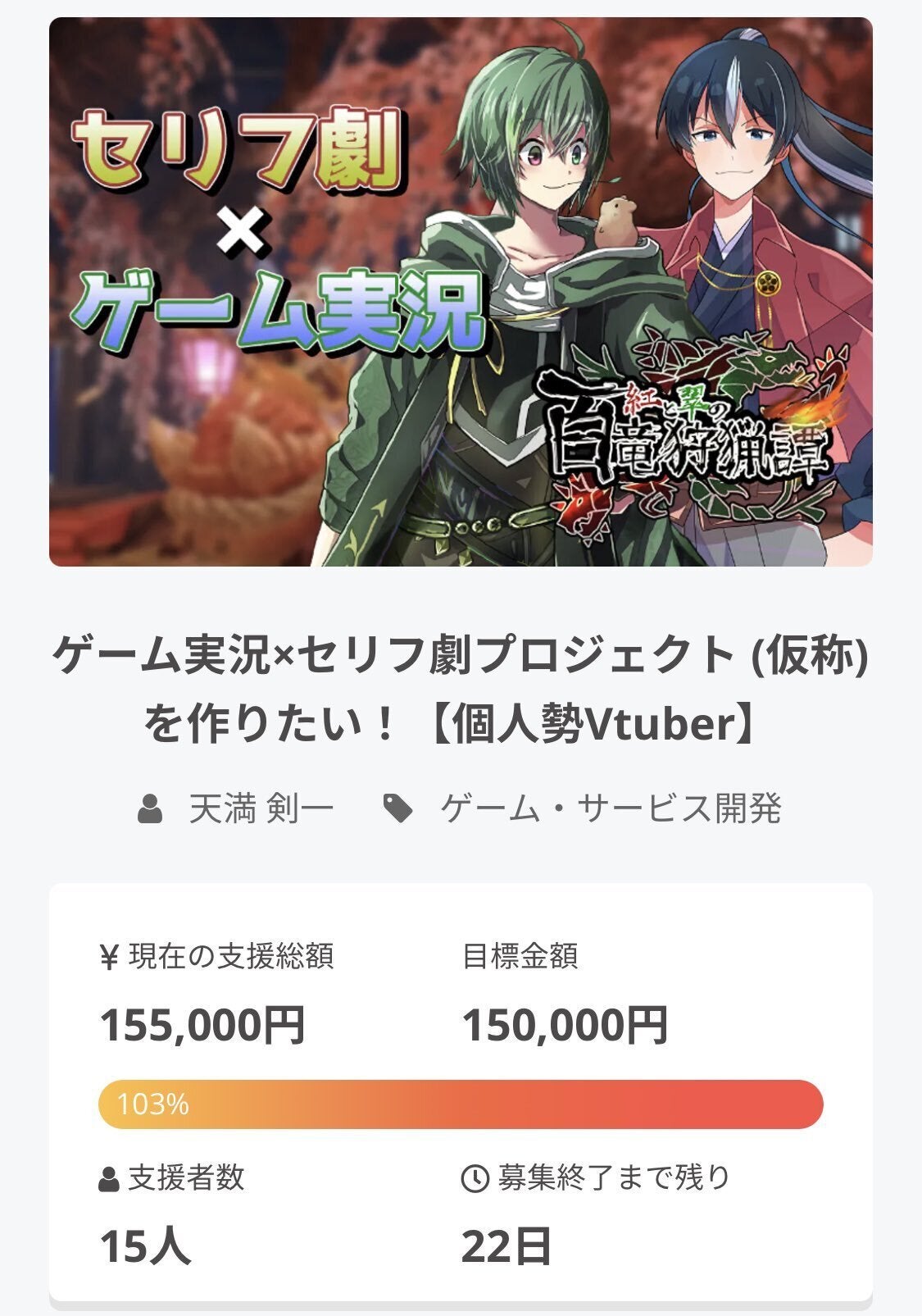 2021/07/06 00:44お世話になっております。皆さまの支援のおかげで、2021年7月5日。目標金額の「15万円」を達成することができました!!!残りの日数でどこまで到達するかは分かりませんが、当初構想していた作品を製作することができることになりました。拡散・支援していただいた皆さんに感謝し、終了後も全力でかからせていただきます。本当にありがとうございました。 もっと見る