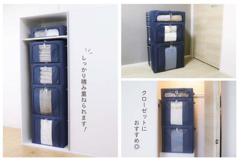 スチールと底板でしっかりと積み重ねられます。クローゼットや押入れ収納におすすめです。