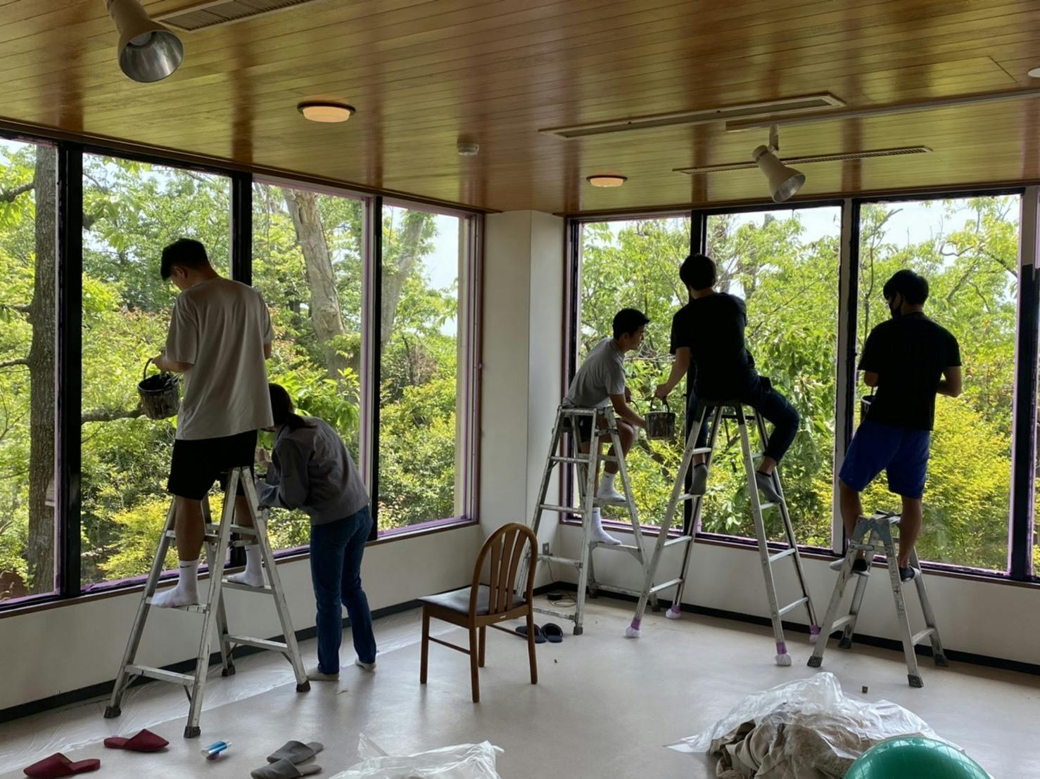 集まったメンバーで、DIYセルフリノベーションも行いました。地元のプロの塗装屋さんを講師にお招きして、ペンキ塗りの技術を教わりました。参加したメンバーも疲れながらも頑張ってくれ、DIYとは思えないクオリティで仕上がりました。自分たちで塗った壁は、やはり愛着がわき、いいですね。