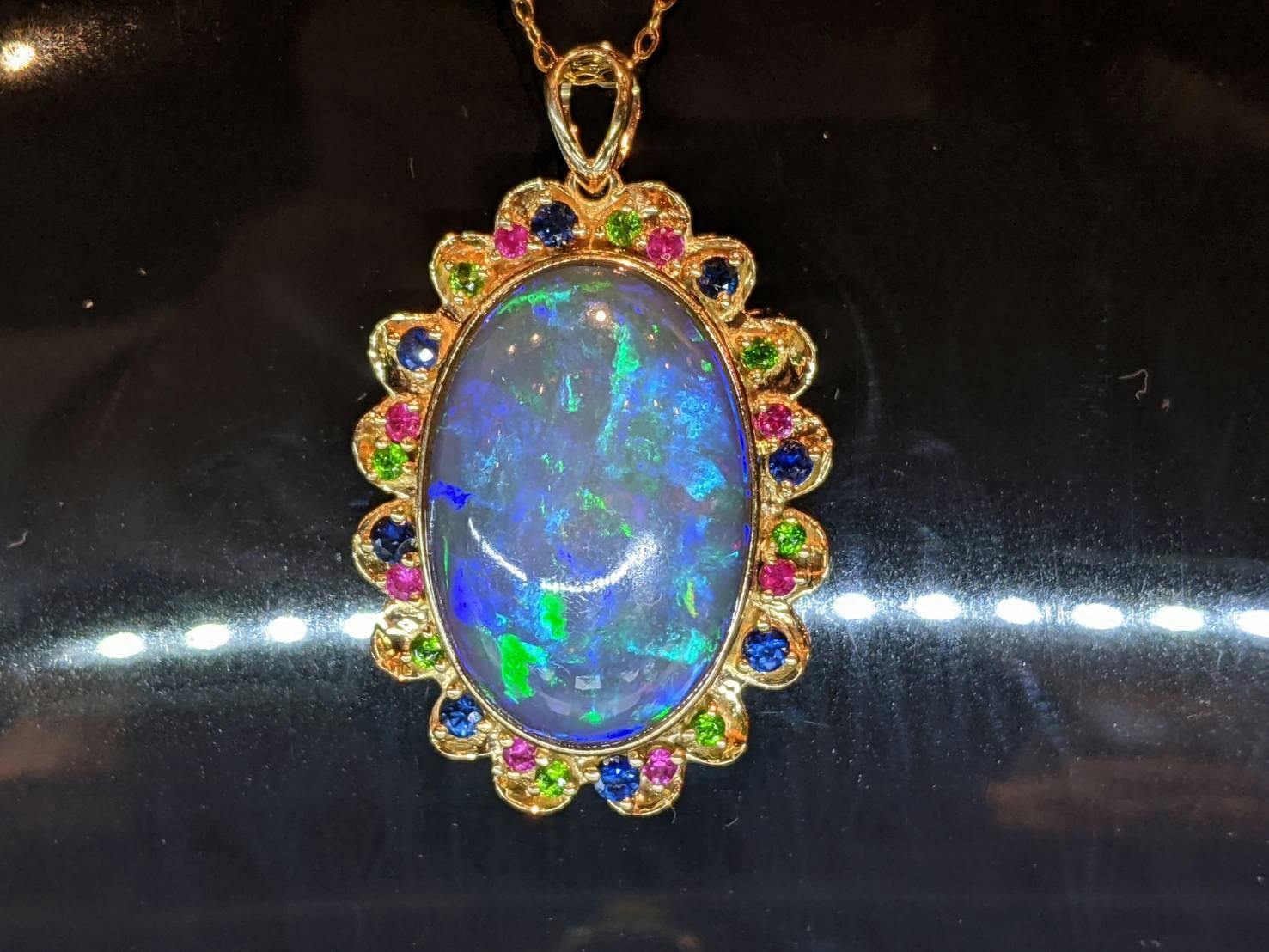 ■素材:K18、天然ブラックオパール約16ct、ルビー・サファイア・トルマリン(脇石)