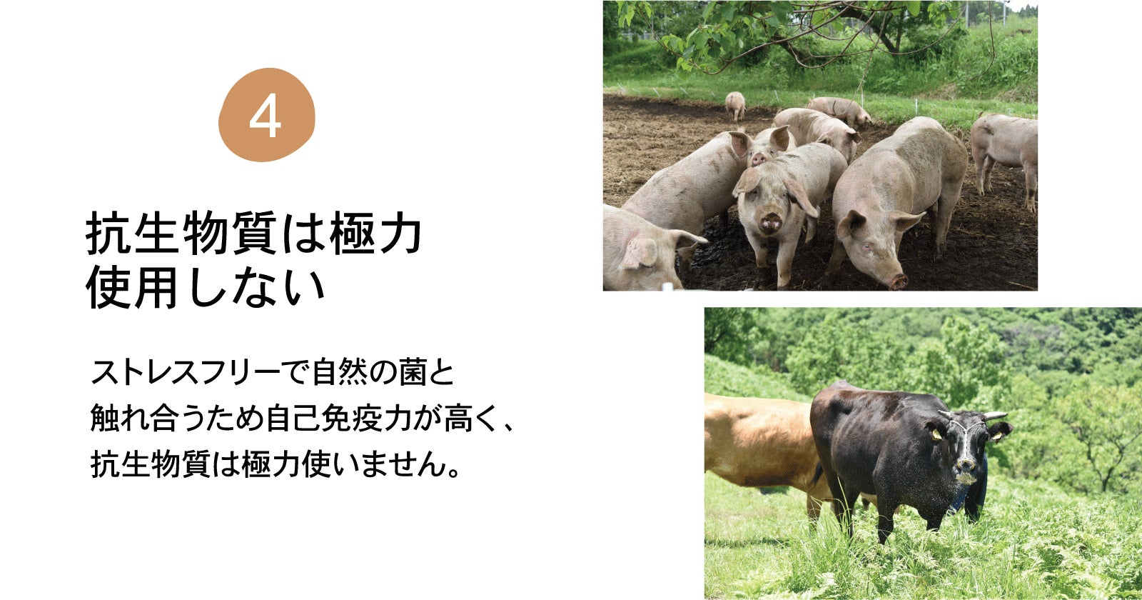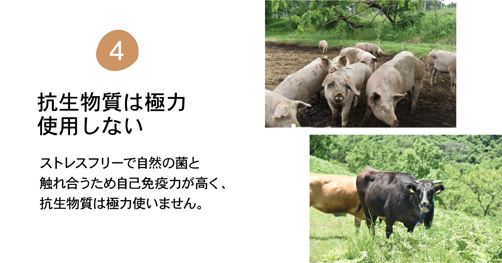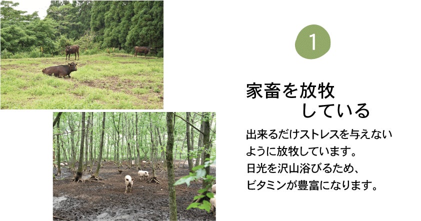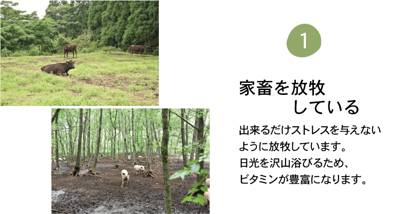 循環型の畜産のポイントは、「家畜にストレスを与えないようにする」というところにあります。放牧し、日光を浴び、自然界の菌に沢山触れて育つ家畜は自己免疫力が高く病気になりづらくなります。