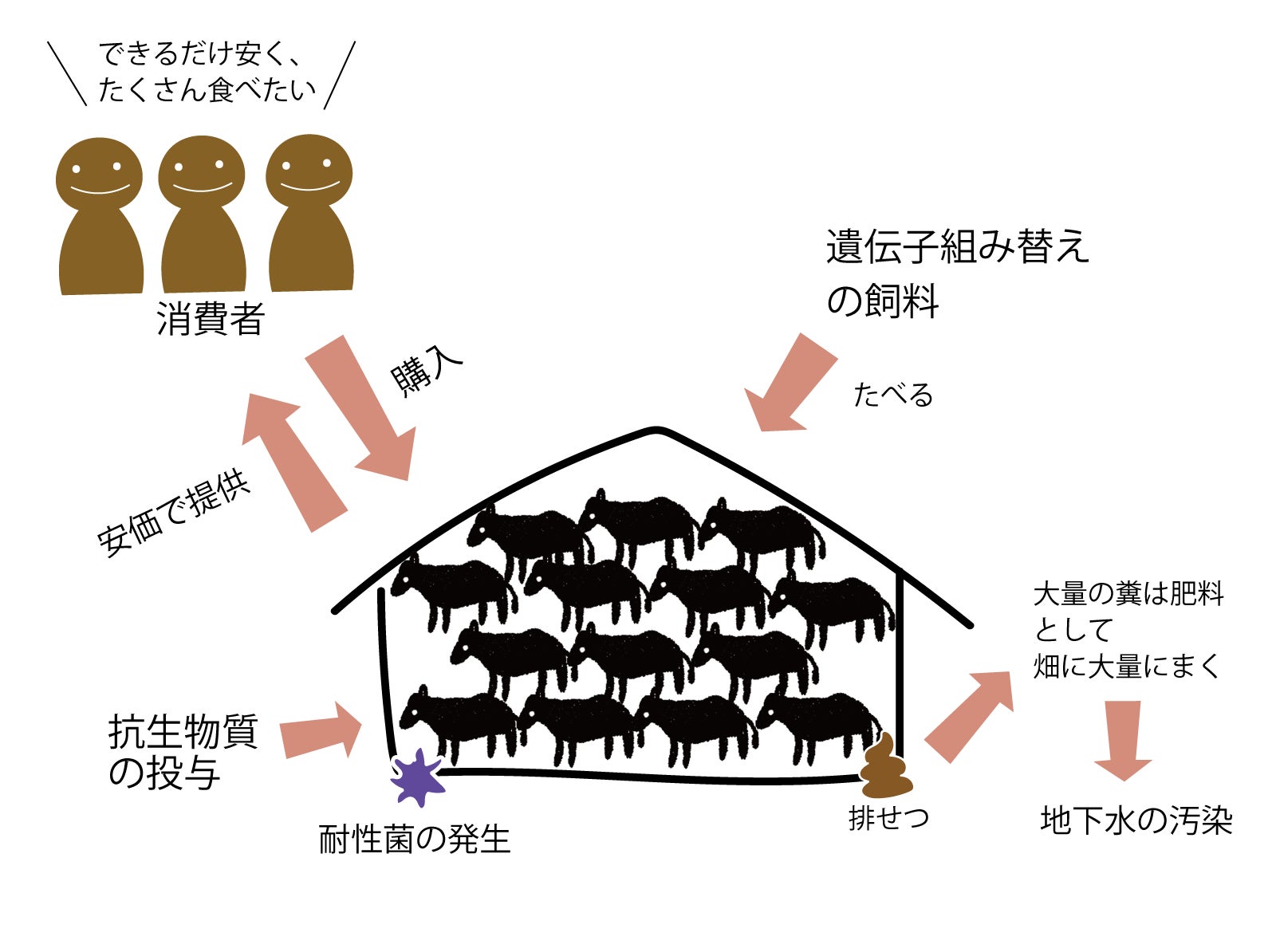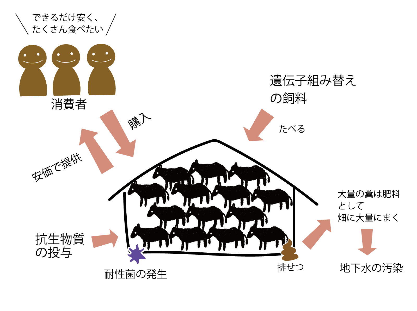 遺伝子組み換えの飼料を与え、脂肪をつけさせるために狭い場所で育てます。自由に動けない牛にはストレスがかかり、免疫が低下します。病気の予防のため抗生物質を頻繁に投与し続けるため過剰投与になります。これが原因で抗生物質への耐性菌が生まれ、人にまで害を及ぼす危険性があると言われています。家畜の排せつ物も処分のために畑に過剰にまくため、自然の力では分解しきれず地下水を汚染しています。