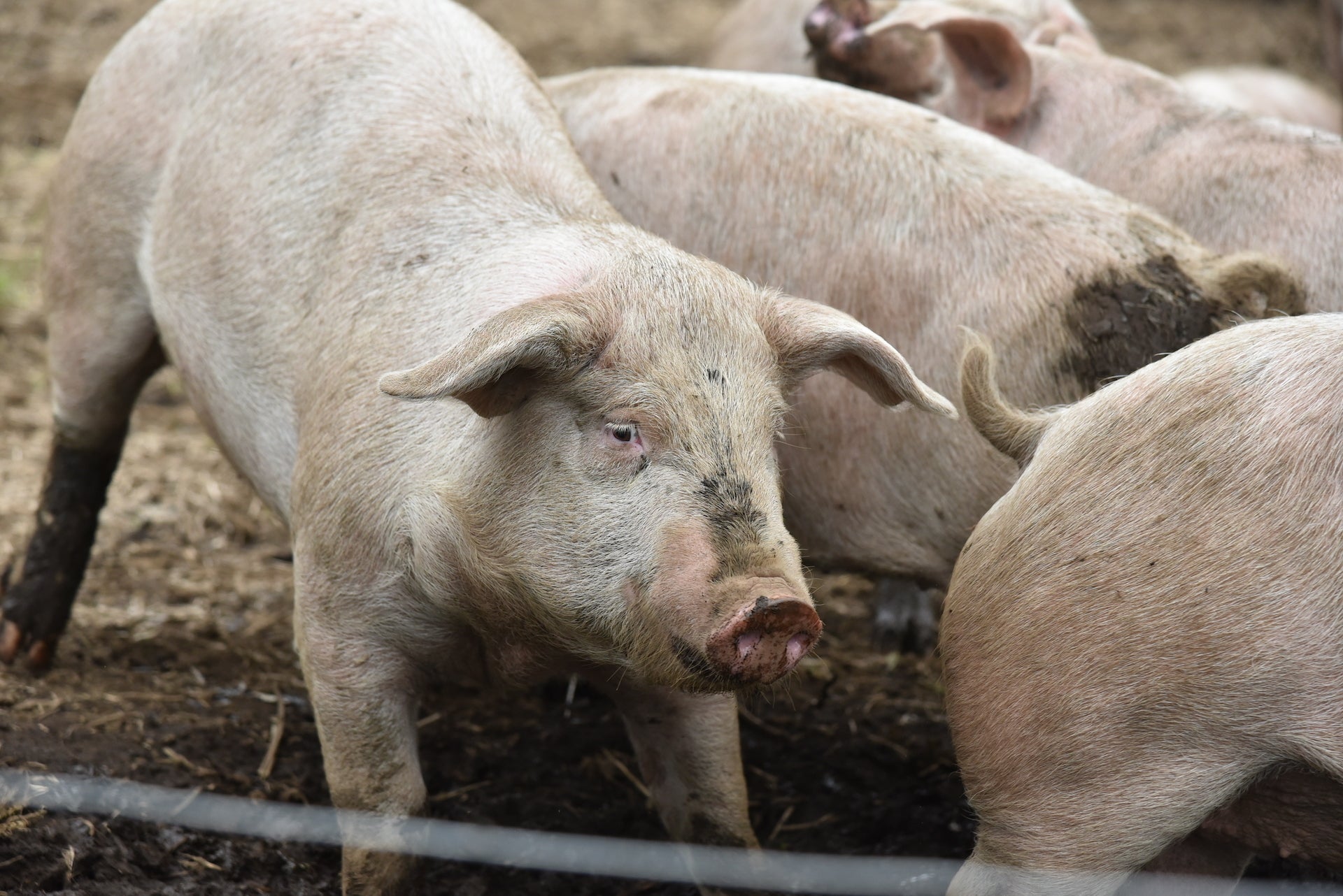 日本で豚の放牧をしている養豚場は0.01%。一般的な豚の飼育面積は一頭あたり1平方メートルですが、やまあい村はその80〜100倍の面積で放牧しています。