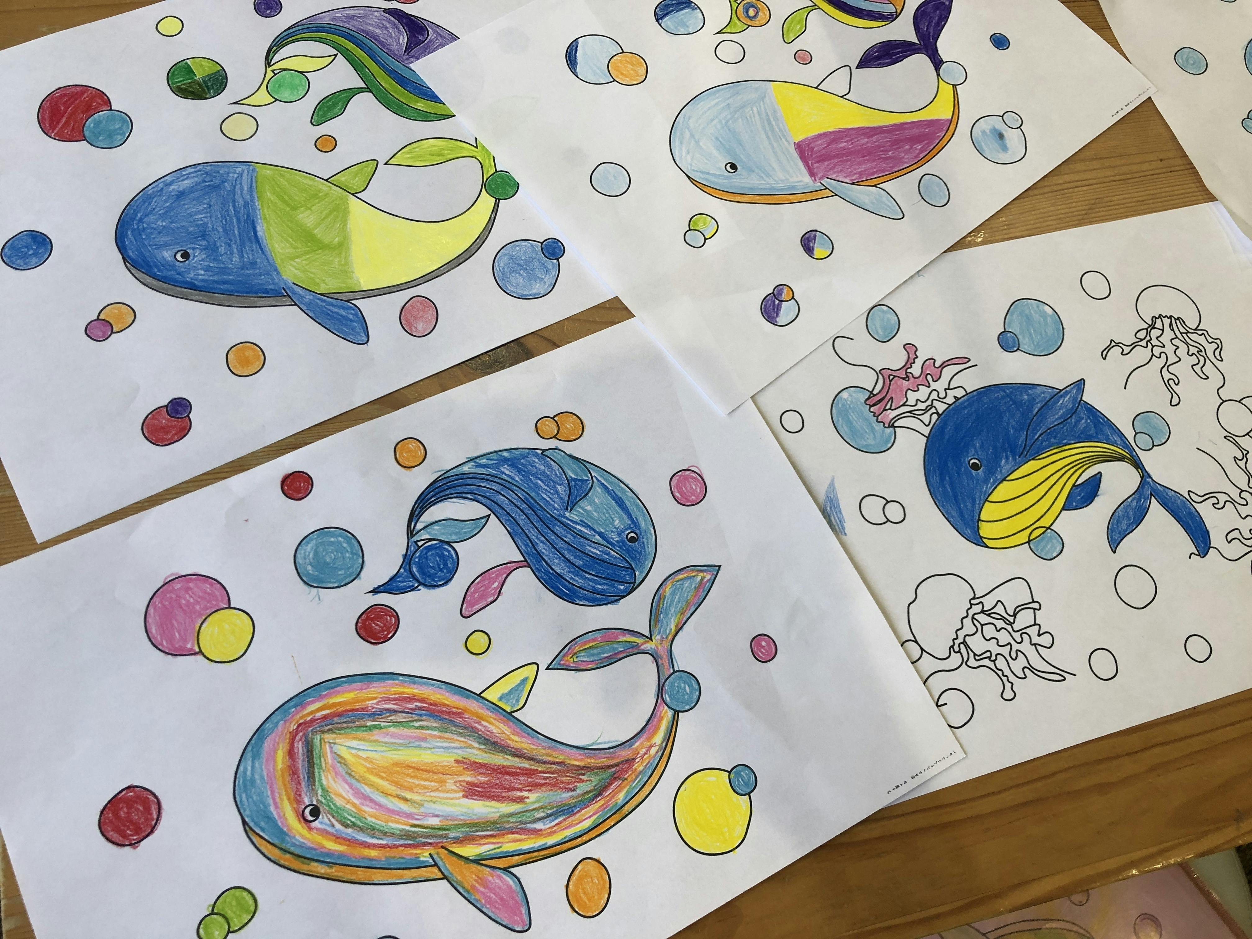 海は「青」クジラは「グレー」と、誰もが想像する通りに塗る子ども達でしたが、ボクも色塗りをして縞模様のクジラを描いたり、新たに絵を付け加えたり、クジラにメイクをしたり、いろんな色を使って描いた絵を見せると、どう自由にしていいのかが理解できたようで、好きな物を好きな色で好きなように描く子どもたち。