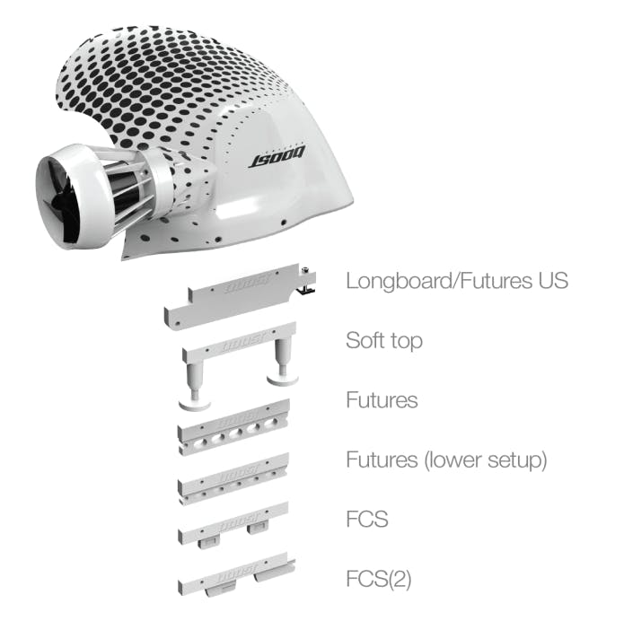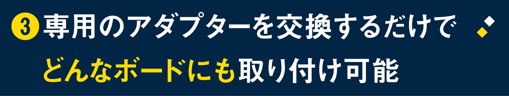 ロングボード、ショートボード、SUP(インフレータブルSUPを含む)、ソフトボード(ソフトトップを含む)、その他(シール式のフィンボックスなど)別売の各種アダプタと交換することで、ほぼほぼ全てのボードに取り付けが可能となります。(Longboard/FuturesUSはデフォルトで同梱となります)