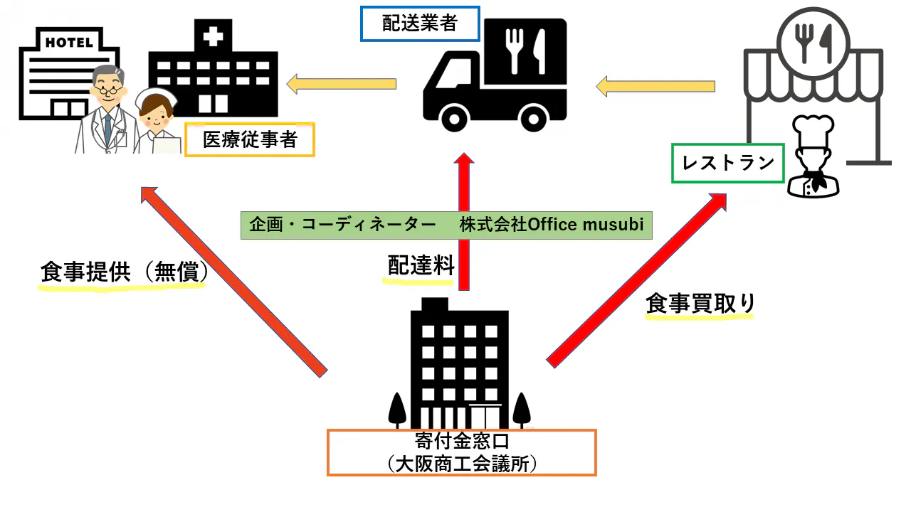 数ある中から私たちのプロジェクトに興味を持っていただきありがとうございます。このプロジェクトは、最前線で闘う医療従事者、苦境に立たされる飲食業界を同時に応援することを目的に、活動を展開しています。2020年5月に株式会社Office musubiが立案、その後「食創造都市 大阪推進機構」が事業主体となり本格的に活動を開始。企業や個人からの協賛金を資金源とし、1年に渡り活動を継続。変異株による感染拡大でコロナ禍の長期化が予測される中、引き続き医療従事者と飲食業界を支援するため、この度クラウドファンディングでも協賛の呼び掛けを決意致しました。