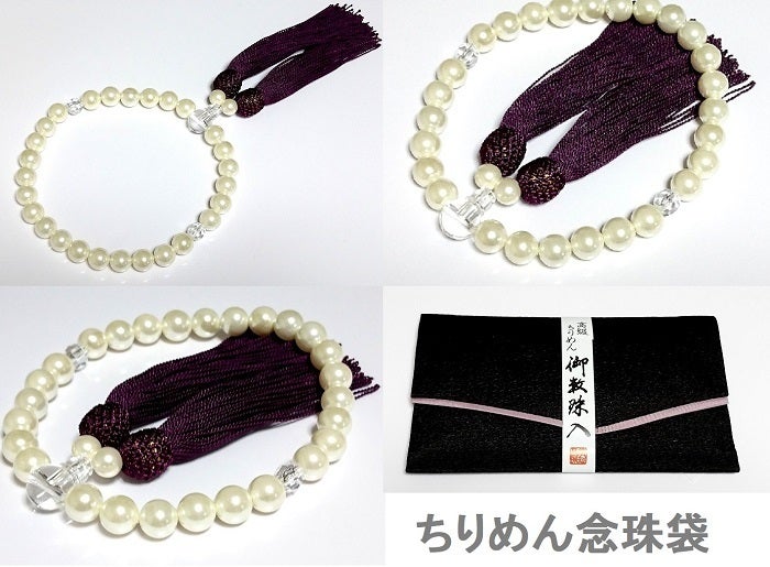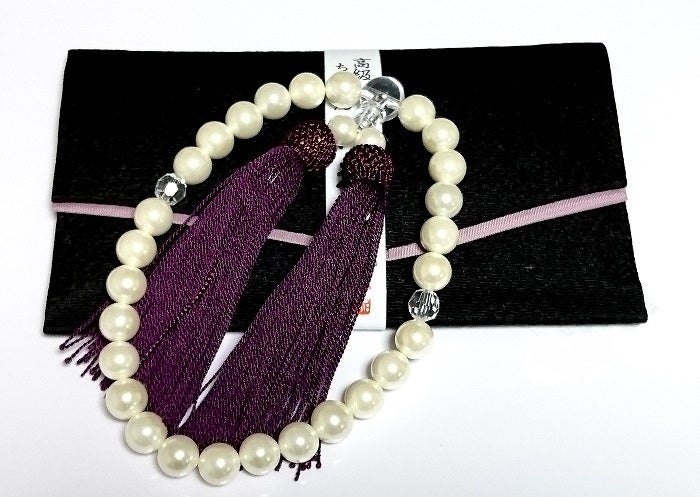 綺麗で清楚、花珠級貝パールお念珠10mm珠 ちりめん袋付