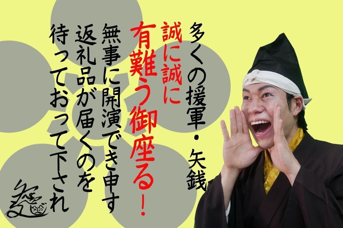 2021/06/02 18:05前田慶次で御座る。 援軍せし皆に礼を申す。 皆々から多くの支援は矢銭が目標額に突破致し申した。 本に有難う御座る。開催決定の伝令から、僅か1日で突破するとは儂も考えておらず、多くの者達の期待と楽しみを感じ申した。細やかではあるが、一つ一つ援軍してくれた者達に我がグッズという形と想い込めて一筆認め申す。楽しみに待たれよ!また、より良い祭りにすべく 皆からの大事な矢銭を丁寧に祭りの費用に使わさせてもらい申す。 祭りの中身、出演者については追って伝令をし皆の期待を更に高めて参る次第。6月末日迄、多くの拡散を始め援軍よろしゅうお頼み申す。此度は、皆からの熱き想い援軍、本に有難う御座った。前田慶次郎利益 もっと見る