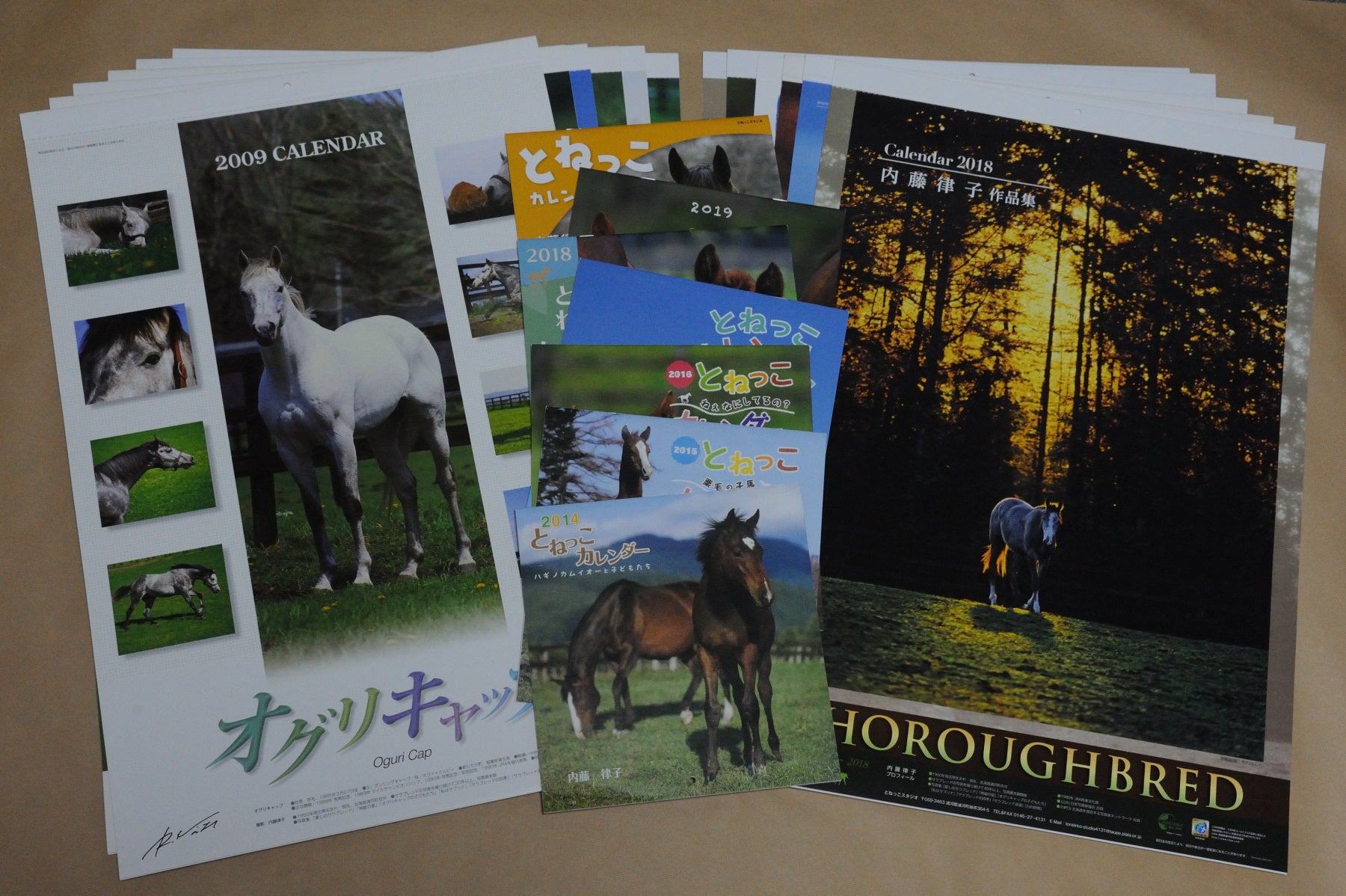 2008年にオグリキャップカレンダー、2009年からサラブレッドカレンダー、2014年からとねっこカレンダーを作り続けてきました。毎年注文してくださるお客様には、個人で馬がお好きな方はもちろん、病院等に寄付される方など様々な用途でお使いいただいていました。