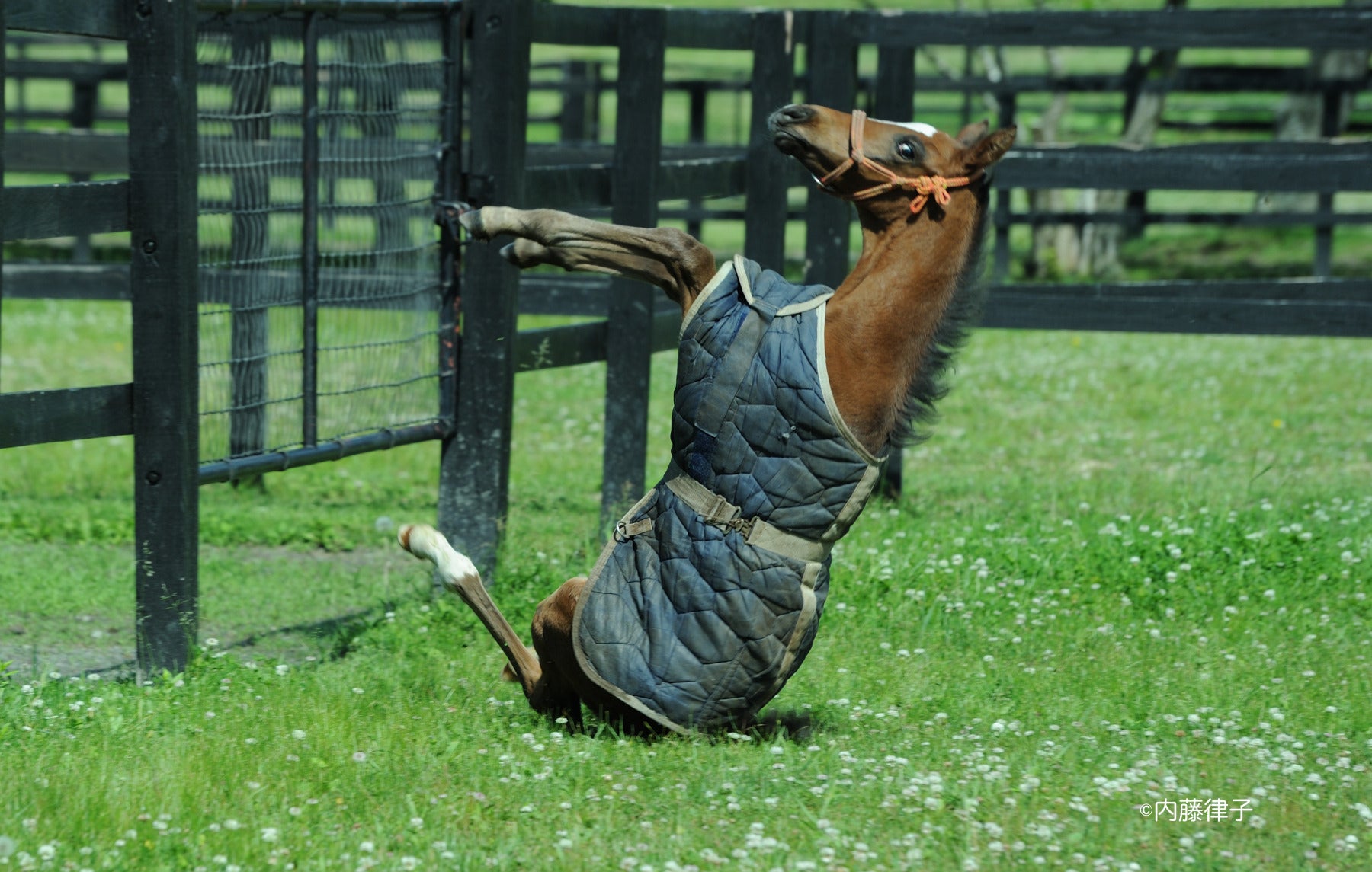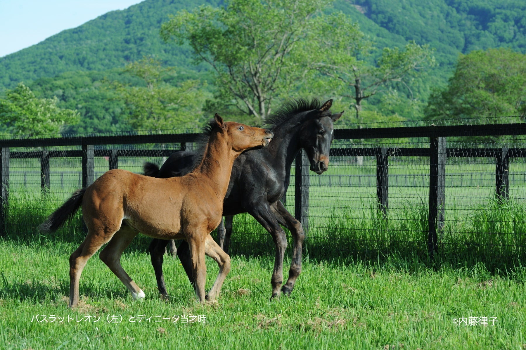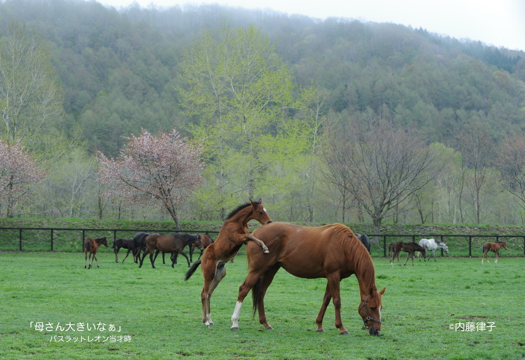 1年お休みしていた間に、私が子馬時代に撮っていた馬たちが活躍し、今回予定しているサラブレッドカレンダーには、表紙(マスターフェンサー&サターン)、1月(マスターフェンサー)、2月(ガロアクリーク)、6月(バビット&ロードベイリーフ)を予定しています。で、バスラットレオンはと考えたら、サラブレッドカレンダーの2019年4月に使っていました。いつもギリギリまで選んでいるので、撮った年に使ったんですね。このようにカレンダーのモデルになってくれた子が走る時は応援にも力が入ります。だから、今でも毎日牧場に通い成長を追っています。写真1は乳馬の母さんと初めて放牧に出され、喜びすぎての写真。写真3、レオン当才時の写真、とねっこカレンダーにうまく嵌るか考え中です。