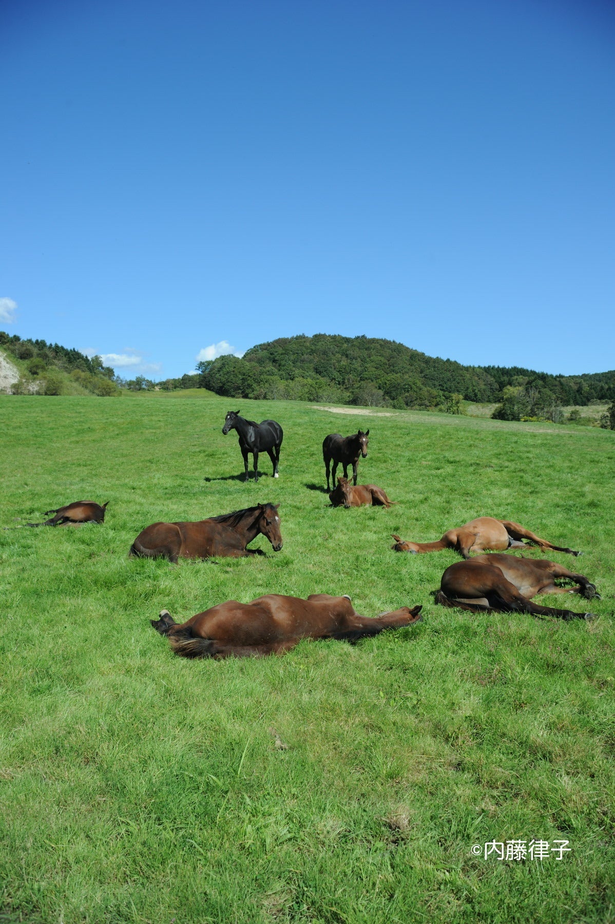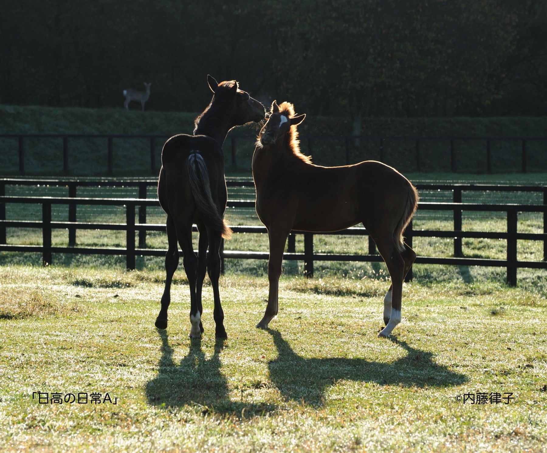 今回は、8月、9月、10月です。「宝探し?」は、放牧地にできた水溜りに興味津々。このように、足で掻いたり、寝転がったり、子馬にとっては交流の場になっています。9月はまだタイトル決まっていません。離乳が終わった子馬達は、まだ、離乳の終わっていない、母馬のまわりで寛いでいます。今はほとんど、1・2頭づつ、母馬を抜いていく方法が多いように思います。「日高の日常A」 皆さんも、もうご存知のように日高はエゾジカの天国でもあります。この牧場はネットを張っているので、土手にいますが、馬達も慣れっこになっています。