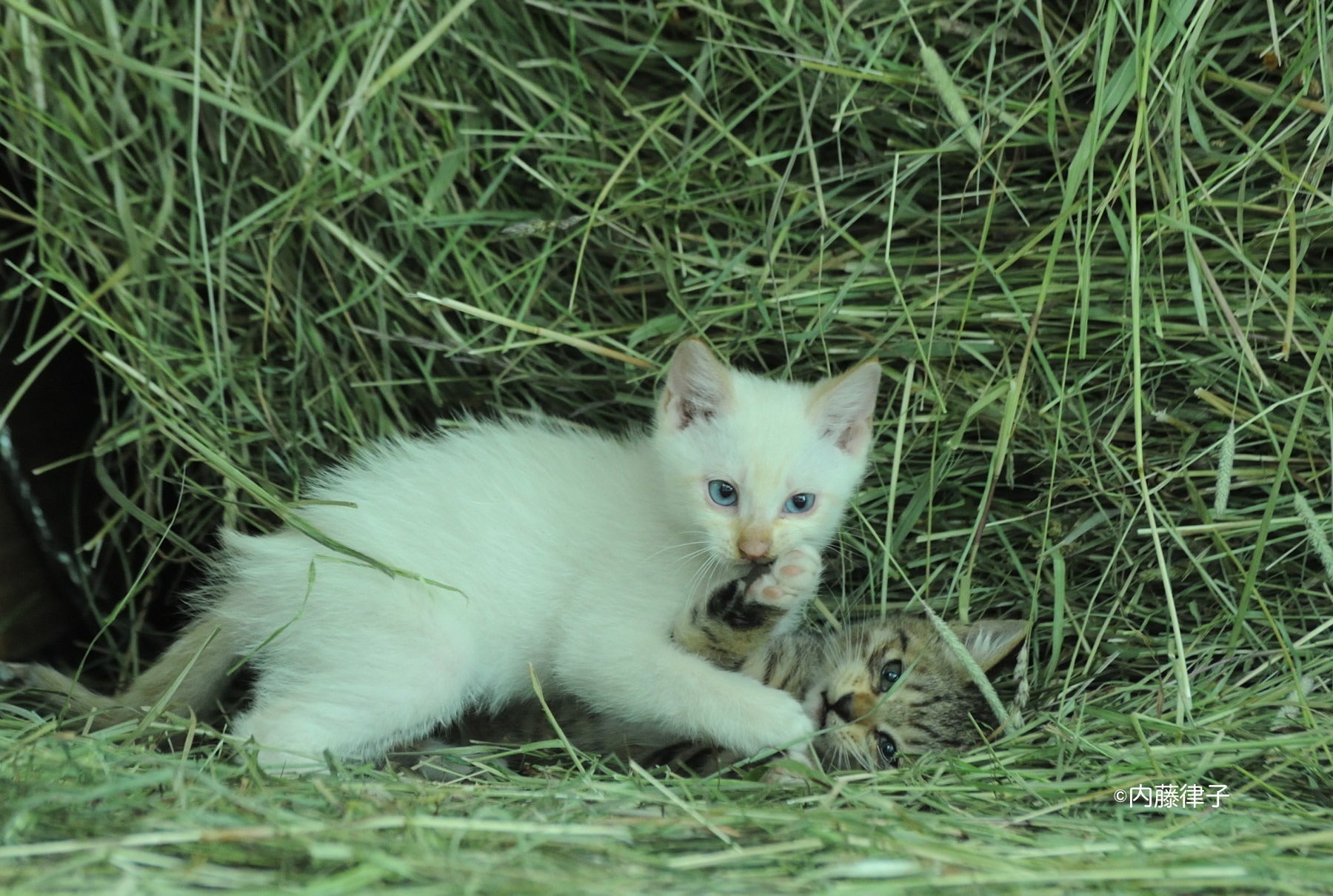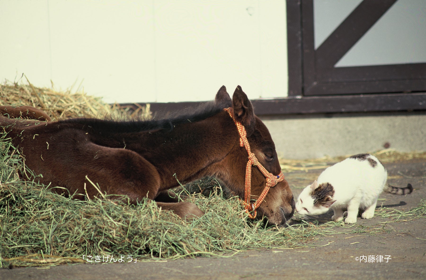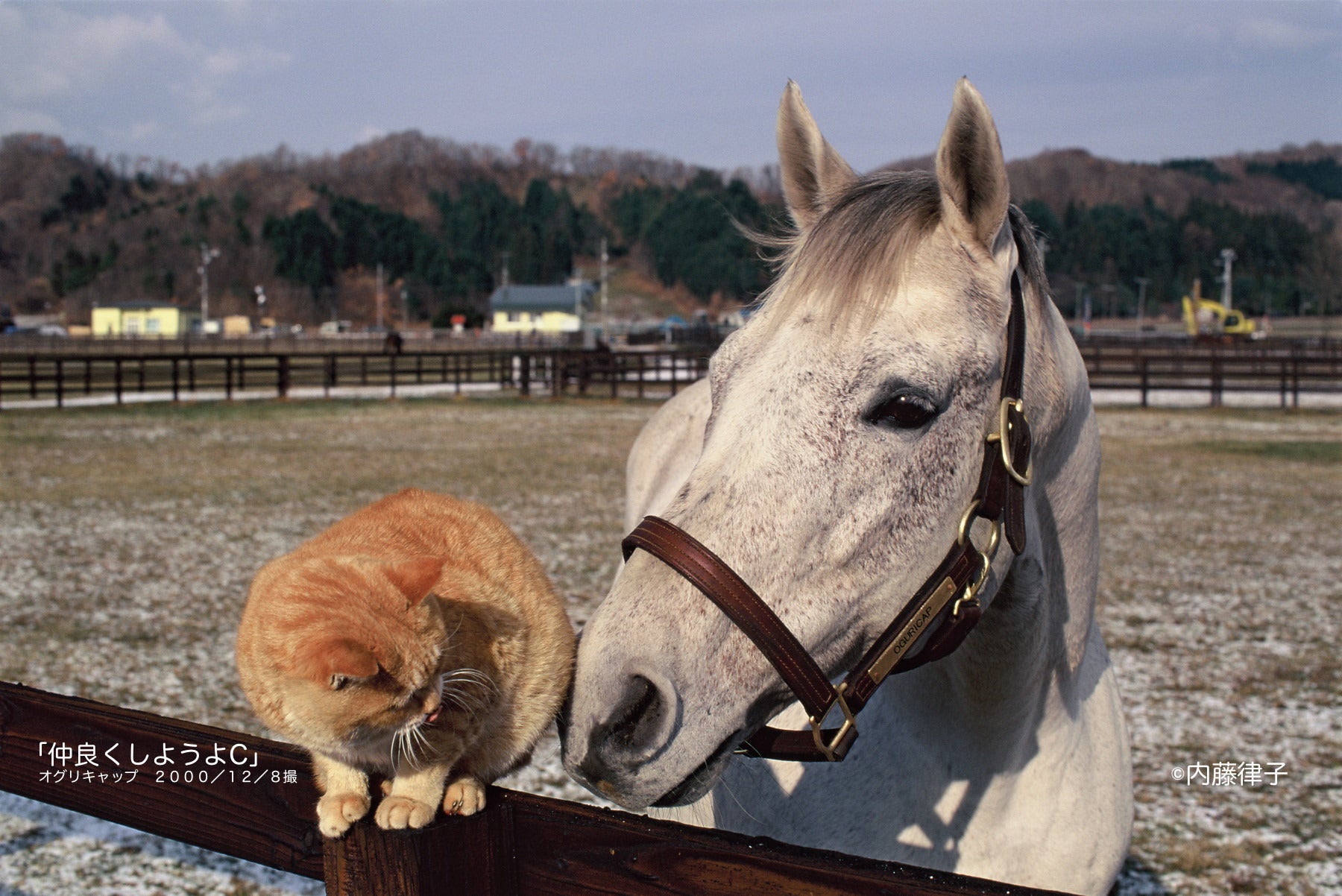 最初の活動報告に書きましたように、2008年の東京競馬場にオグリキャップが来たのがカレンダーを作り始めたきっかけでした。2004年、私の写真集「サラブレッド浪漫」のための写真展に写真1を並べると人だかりが出来ました。お話を伺うと、お互い見ず知らずの方々で、オグリファンということで、話が弾んでいたのでした。残念ながら、子馬達の活躍がなく、オグリの情報も途絶えがちでした。「よし!今のオグリの姿を伝えよう〜」と撮影を再開、写真集「白の時間」へと続けたのでした。特にオグリとキンギョという猫のシリーズが人気でした。写真2は私が初めて撮った猫の写真、ハギノカムイオーの子馬でした。やはり、猫や犬との写真は人気がありますが、犬や猫に度胸がなければ撮れません。今、厩舎で生まれた猫の兄弟がいます。どうにか馬と絡まないかなと狙っています。これが、私の撮影スタイル、気長にじっくりやって行こうと思います。いやいや、あっという間に諦めることも。私の撮影する時の思い、心がけ、少しづつ書いていこうと思います。