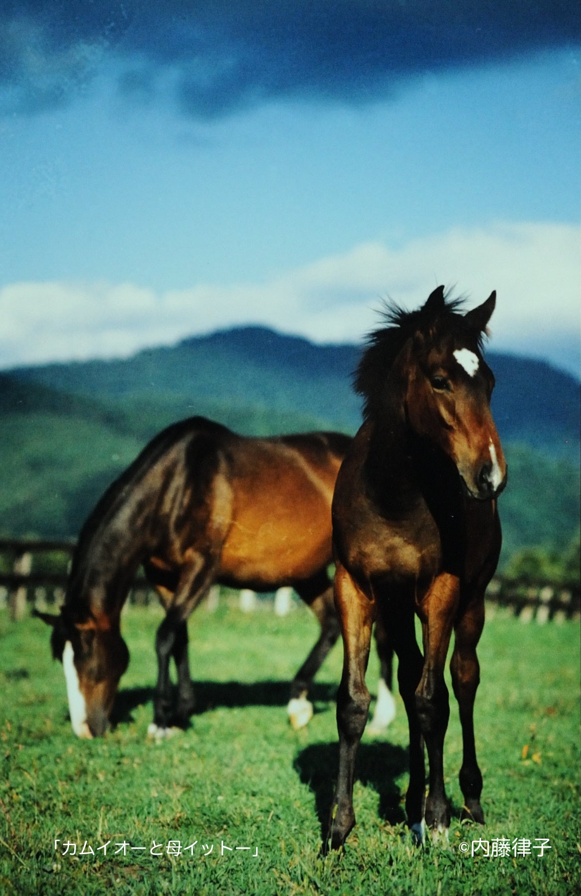日高に入って、初めは若駒や内国産種牡馬を中心に撮影していましたが、1979年の夏、「競馬報知」の依頼でカムイオー(競走名ハギノカムイオー)に会いに行きました。母イットーが、今風に言うと最優秀2歳牝馬&古馬牝馬に選ばれたような馬で、初子のハギノトップレディが、函館の新馬戦を日本レコードで勝った後でした。カムイオーは4/1生まれでしたが、どちらかというと小さい方でした。それでも放牧されると、母さんとは反対方向にいる仲間の方に一直線、戦いの中心にいるような子馬でした。子馬の成長を追いかけるのもいいかなと思った初めての馬でした。そして14戦8勝(重賞6勝)で、戻って来たカムイオーの子馬や孫達を追いかけるようになったのでした。牧場に泊めていただき、お産も沢山撮らせていただきました。その時「汗かいたら、洗ってもらったら気持ちいいだろう!」とお産後の母馬を洗う姿に感動したものでした。写真1 初めて会った時のカムイオー(2014年とねっこ表紙)。写真2 レディとダイイチルビー誕生の瞬間(2017年サラブレッド2月)。写真3 レディの子供ウメノアスコット(2014年サラブレッド6月)。生産牧場の内側から撮るチャンスをいただき、これが私の撮影スタイルになったように思います。