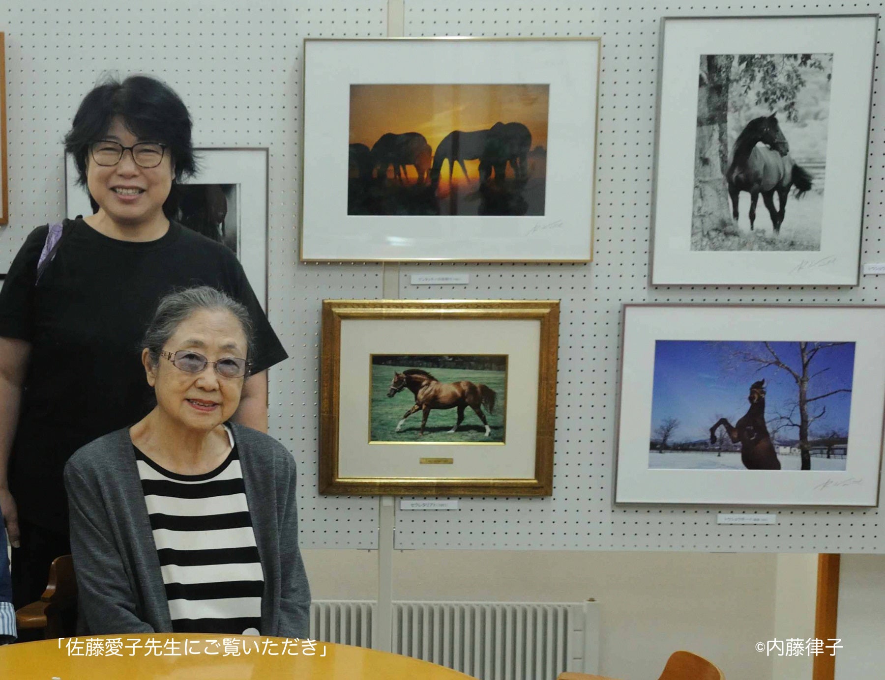 私にとっての写真展は、作品を発表するだけでなく、ファンの方達との交流の場でもあります。なかなか、2・3点でのグループ展までは伺えませんが、10点以上の場合は、必ず伺うようにしています。そして皆様の感想を伺い、馬の素晴らしさを語らうのです。皆、それぞれ、馬を好きになったきっかけは違います。それでも馬を語るその表情には、私と共通の表情があります。はじめ、馬を被写体として見始めた頃、ある方に「馬が好きなの?それとも写真」と聞かれたことがあります。若駒の動き、迫力は圧倒的な存在感があり、見ているだけでもワクワクします。でも・・・、それだけではない、何かが私を突き動かしているのだと思います。写真を撮らなくても傍にいるだけでも感じる安心感、そっと抱きしめたくなる欲求、いえいえ、そんなことをしたら危険ですよ。又、億円もの馬もいるのですから。私が馬を撮り始めた頃は、サラブレッド=ギャンブルで、もちろん、電車の中で新聞を広げている人などおらず、ダービー&有馬記念の話題が職場や家庭で語られることなど皆無でした。なんで、こんなに素晴らしい生き物を認めてもらえないのだろうと思ったものです。写真集はなかなか作れませんでしたが、写真展を行い、サラブレッドの魅力を伝えたいと思い行動しました。写真1 阪神百貨店で行われた「白の時間」オグリキャップ写真展の一コマ、この写真は、今も新冠にあるオグリキャップメモリアルに飾っています。写真2 初めての写真集「愛しのサラブレッド」のおかげで、フランスロンシャン競馬場で、凱旋門賞ウィークに行われた写真展、本場ヨーロッパでの馬主の世界を少し覗かせていただきました。写真3 いつも夏に避暑にいらしていた佐藤愛子先生には感想などいただきました。この浦河図書館で2001年より開催しています写真展、今年は、7/29〜8/31までです。是非見にいらしてくださいと言えないのが残念ですが、私はできる限り伺っています。(図書館にお問い合わせを)なお月曜日はお休みです。今では、馬が大好きだから馬の魅力を伝えたいと言えます。これからも頑張ります。どうぞ応援よろしくお願いいたします。