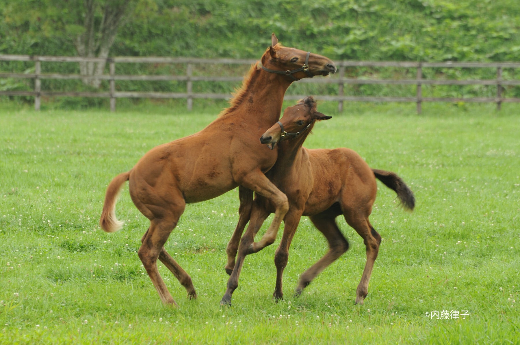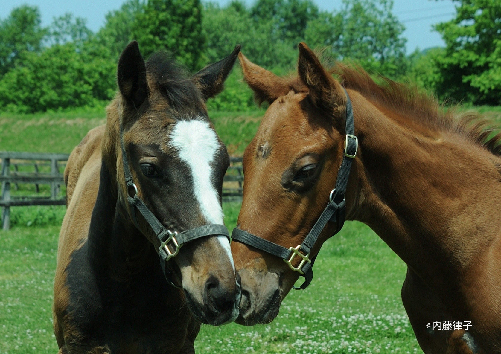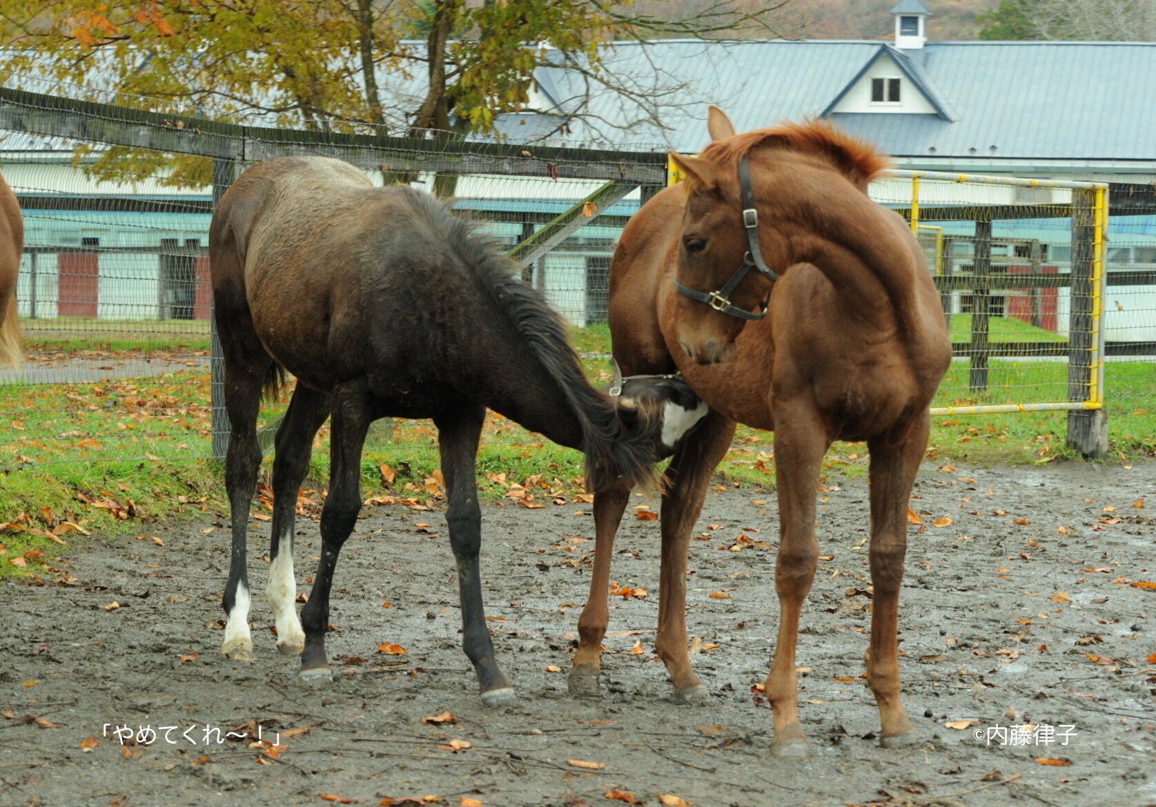 初めて子馬に興味を持ったのは、ハギノカムイオーの取材からでした。私が訪れた8月は、4/1生まれのカムイオーにとっては、友達と遊ぶことが一番でした。母イットーとの絡みを期待して見ていても、お乳を飲む時だけ、ただただ遊びまわるカムイオーでした。そんな時、一頭の子馬には、他の子と接し方が違うように思い、追いかけてみました。それは、ちょっと華奢な女の子、テツノホームという名前まで覚えています。どちらかというと小さめなカムイオーでしたが、男の子同志の時は、負けていないのですが、その女の子の前では、おとなしく寄り添っており、下手をすれば、怒られてもじっと我慢をしているようにも感じました。あら、もう異性を意識しているのかと興味が湧き、追いかけてみようかと思いました。当才は50キロぐらいで生まれても年を越す頃には、300キロ近くになりますが、人間でいうと幼稚園か小学校の感じ、見ていて飽きません。写真1は、ピュアオーシャン(中ー大井所属)と仲間達、手前がウォーターハミング(引退し繁殖に)左がサワヤカプリンス(大井所属)いつもつるんで遊んでいました。写真2 ピュアとサワヤカ、本当にいい相棒で相撲を取ったり、追いかけっこをしたり、お互い切磋琢磨していました。写真3 あら、ハミング優しいピュアを選んだのかぁ?写真4 離乳後の写真です。お乳のあたりに顔を突っ込むハミングに困ったようなピュアの表情が笑えます。毎年、子馬達の日常は変わりなく、そして、毎年新しい感動を与えてくれます。だからサラブレッドをいつまでも追いかけてみようと思います。乞うご期待!!