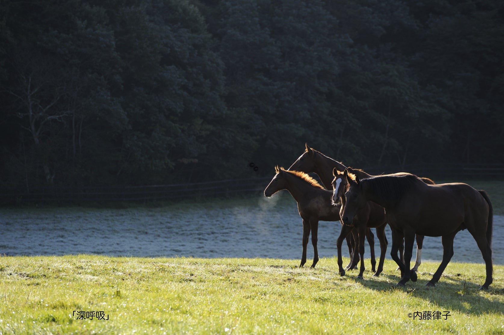 とうとう明日までになりました。あっという間の40日でした。残念ながら、まだ目標達成には至りませんが、多くの励ましをいただきました。あと2回の活動報告は、私の思い入れの写真をご紹介いたします。写真1「光の行くへ」 撮影に時間をかけました。落葉の間からの光が気に入り、そのポイントに馬が来るまで何日か待ちました。栗毛の馬、鹿毛の馬、馬の向きや頭数、朝の光はどんどん変わります。本当に偶然に近い一瞬でした。やはり写真は光ですね。写真2「深呼吸」 本桐牧場生産のネロとニシノラピートが、日高に戻ってきた時、同じ年だね。確か一緒に放牧されていなかったかぁとパソコンをチェックして見つけた埋もれていた写真です。2010年からデジカメを始めたばかりで、整理もせず、パソコンに入れっぱなしでした。有難う!ネロとラピート、今ラピートは同じ放牧地で子育てに励んでいます。写真3「窓辺の親子」 毎年のようにお邪魔し、牧場の方の協力のもと撮影したものです。(2022年版の10月も)他の写真と差別できるので貴重な牧場です。高岸さん有難うございます。写真4「五重唱」 この写真は大きな画面で見ていただきたい写真だと思っています。写真展の時も大きくしました。結構ありそうでない貴重な写真だと思っています。明日はラストよろしくお願いいたします。