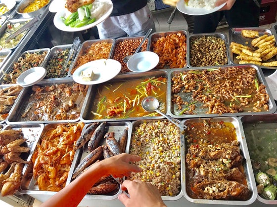 こちらの写真は、タイでよく見る屋台の風景です。様々な料理が並び、お客さんはこの中から好きな料理を選び、店員によそってもらいます。